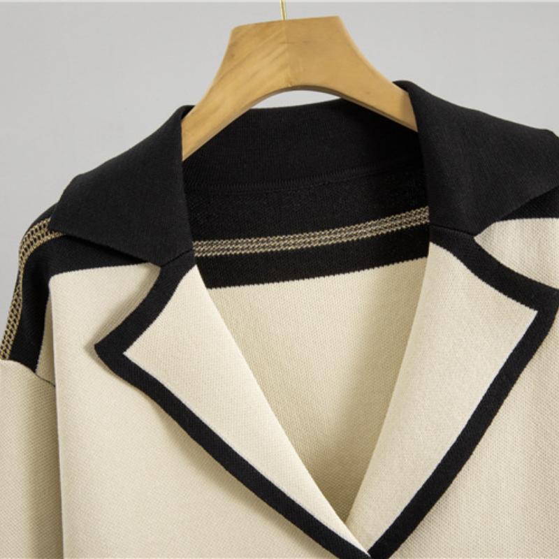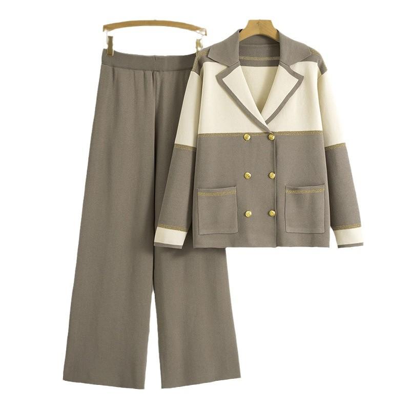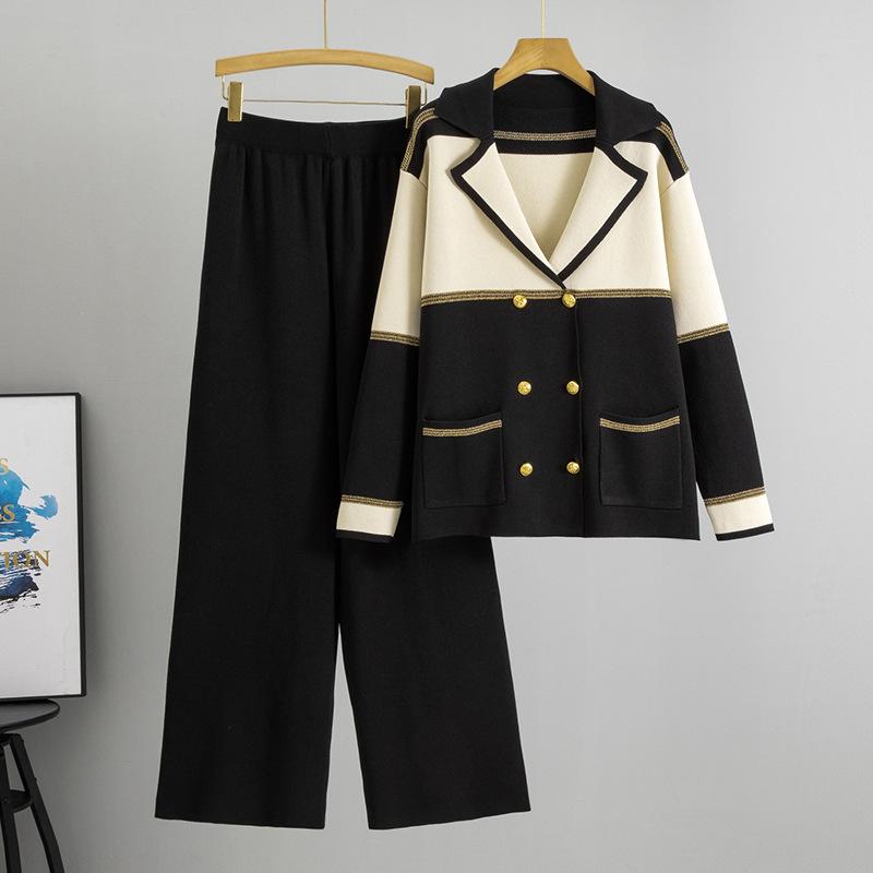 Женский костюм больших размеров с воротником-стойкой, осенний новый двубортный трикотажный топ, широкие брюки, костюм из двух частей