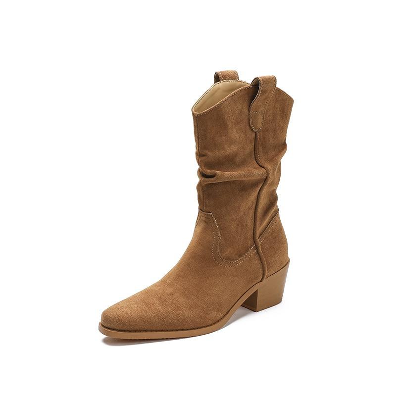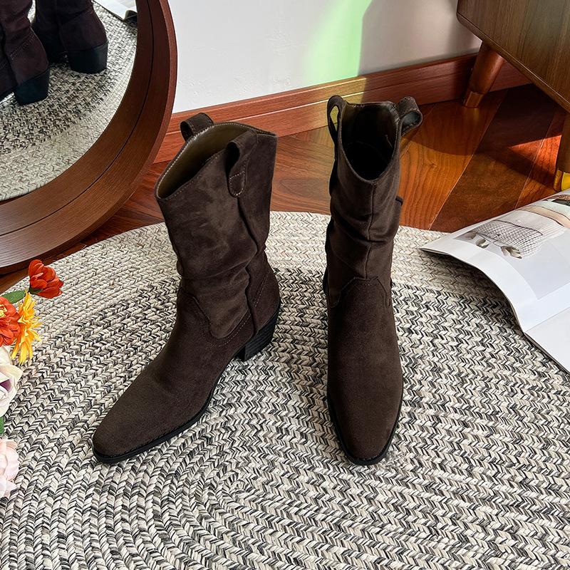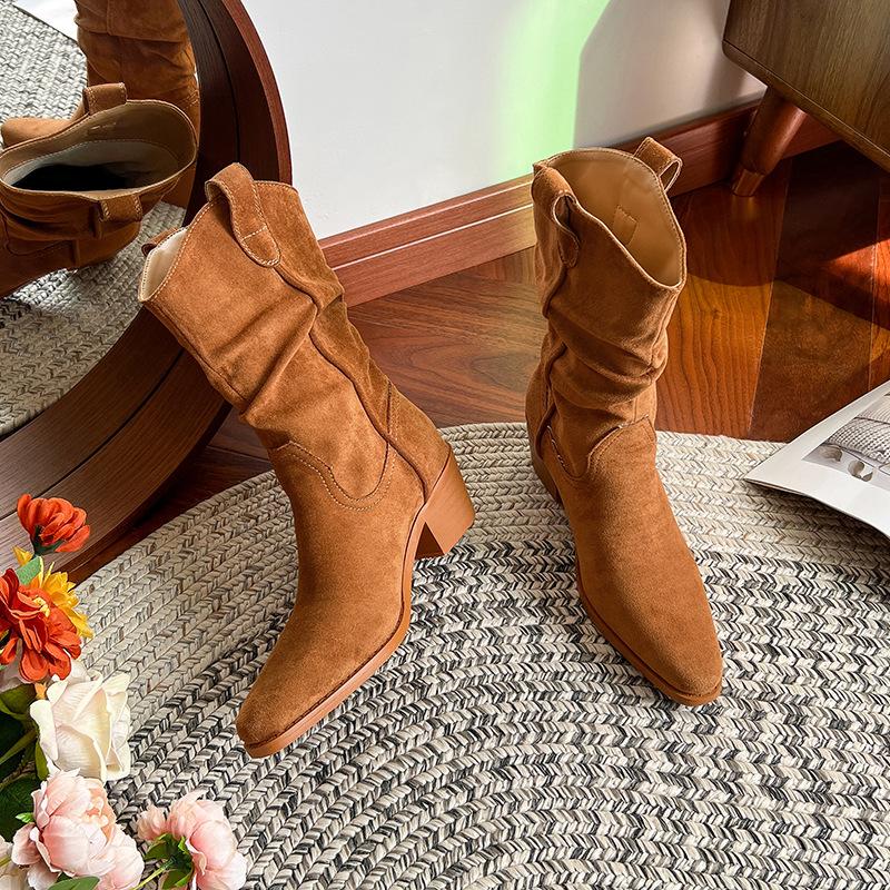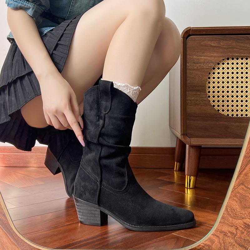 Большой размер -4 ковбойские сапоги женские осенние новые остроносые на толстом каблуке плиссированные на наборном каблуке короткие ботинки Мартина рыцарские сапоги