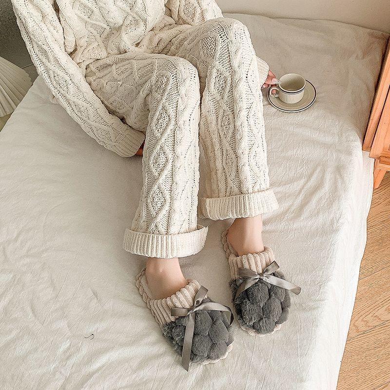 Милые хлопковые тапочки с бантом, женские плюшевые, новые осенне-зимние, для дома, нескользящие, на толстой подошве, пушистые тапочки