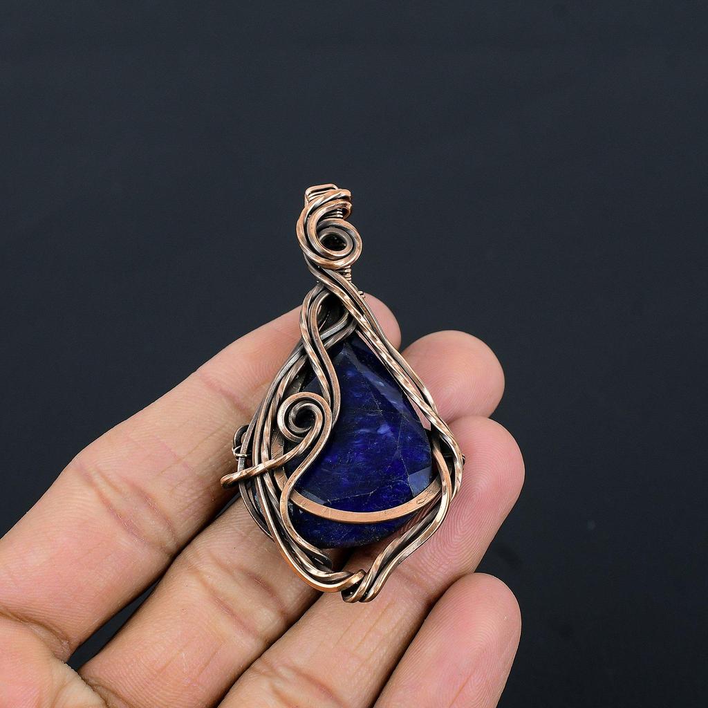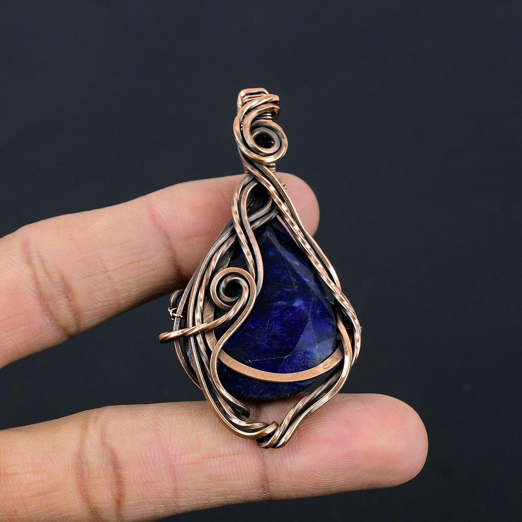 Кулон с синим сапфиром, Кулон с драгоценным камнем ручной работы, Кулон, обернутый медной проволокой 999 пробы, Антикварное украшение, Для подарка на помолвку
