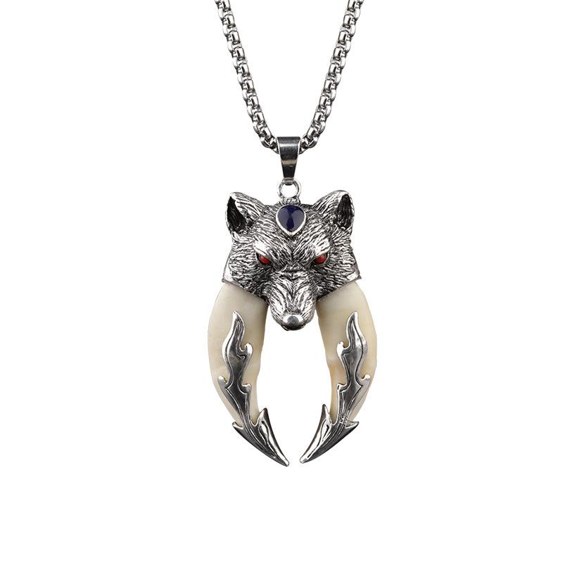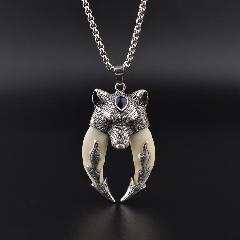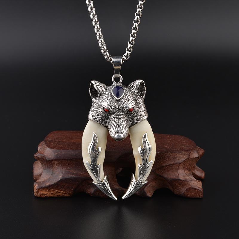 Антикварный кулон-талисман с двойным клыком кабана и серебряным волком в подарок