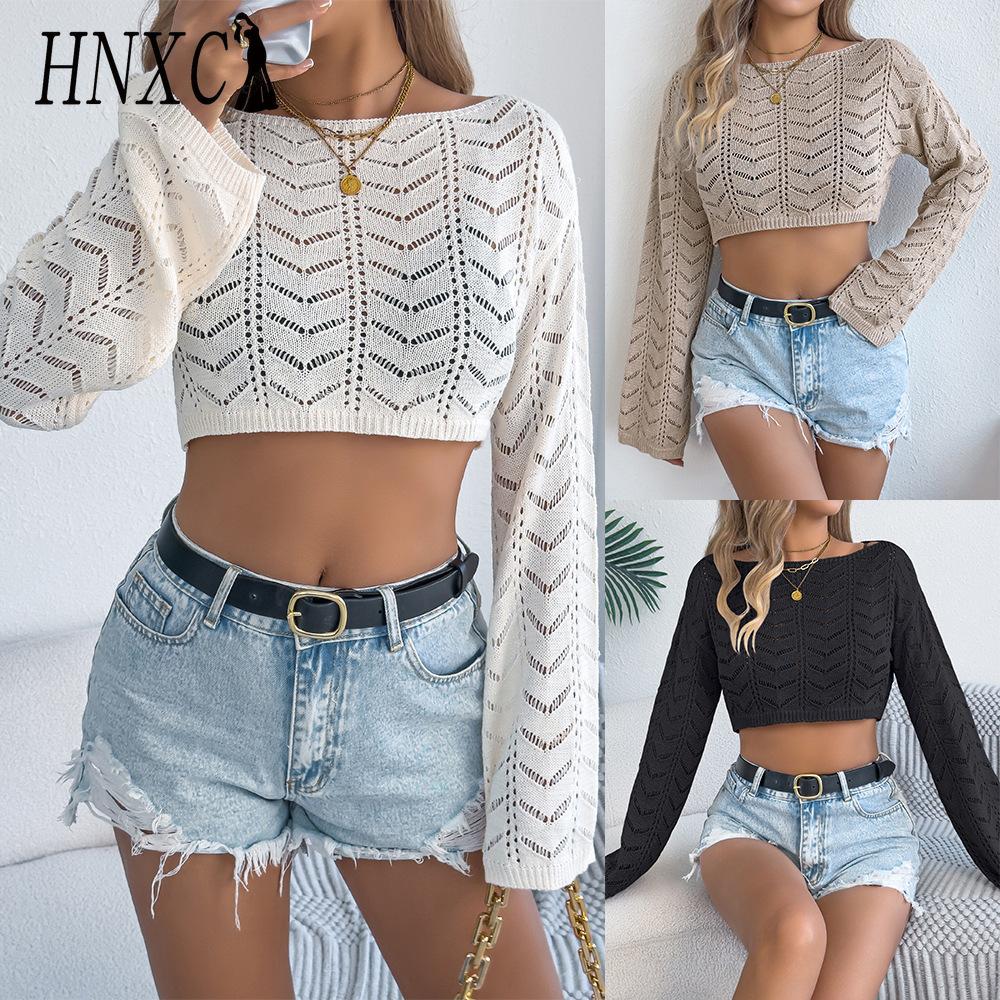 HNXC Весенне-летний однотонный ажурный свитер с расклешенными рукавами, повседневный свободный вязаный топ, женская одежда для отпуска