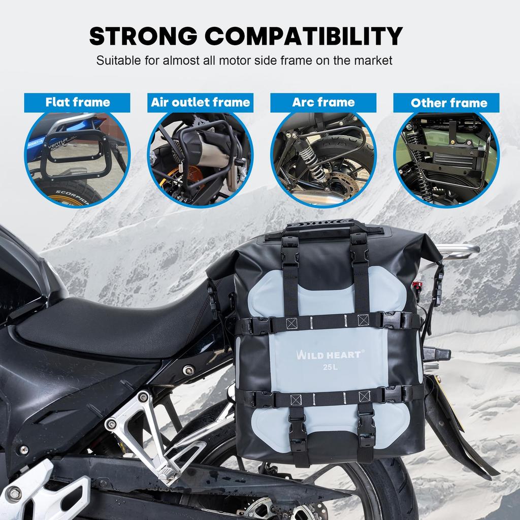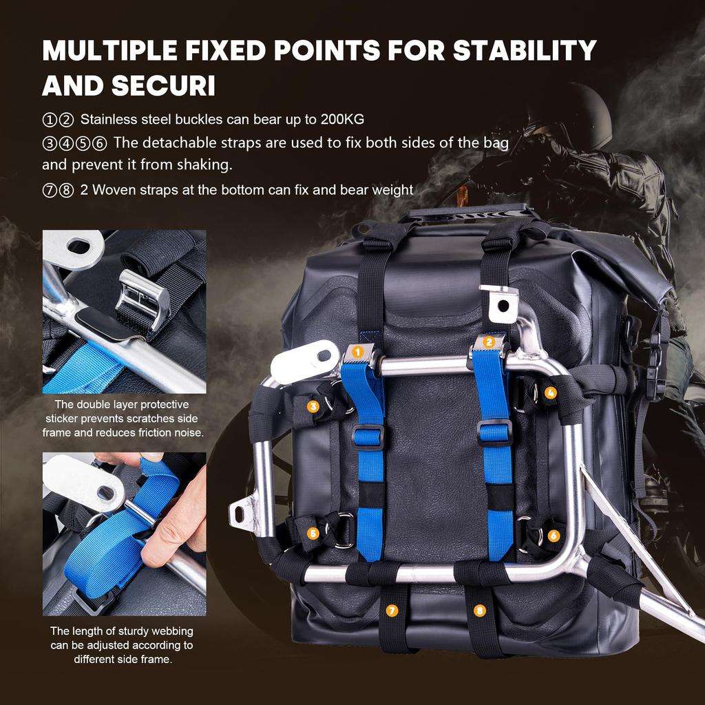 4. There are eight fixing buckles on the front of the main body, which can fix the bag to the side frame of the motorcycle, improving stability and preventing it from falling off.