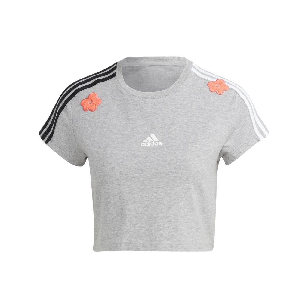 Adidas Футболка с цветочными нашивками из синели и логотипом в полоску с круглым вырезом и короткими рукавами, женские топы среднего размера, конопляно-серый IC0027