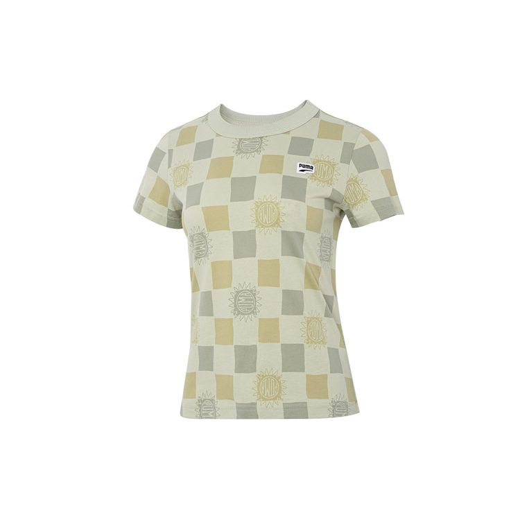 Puma Футболка Downtown Aop с клетчатым логотипом, круглым вырезом и коротким рукавом, женские топы, светло-зеленый цвет 535379-33
