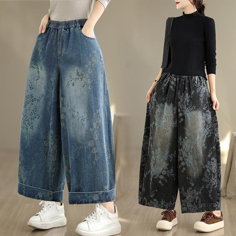 DIMANAF 2025 Большой размер Осенние джинсы Новые длинные брюки Цветочный принт Женские свободные джинсовые брюки Большой размер Повседневные