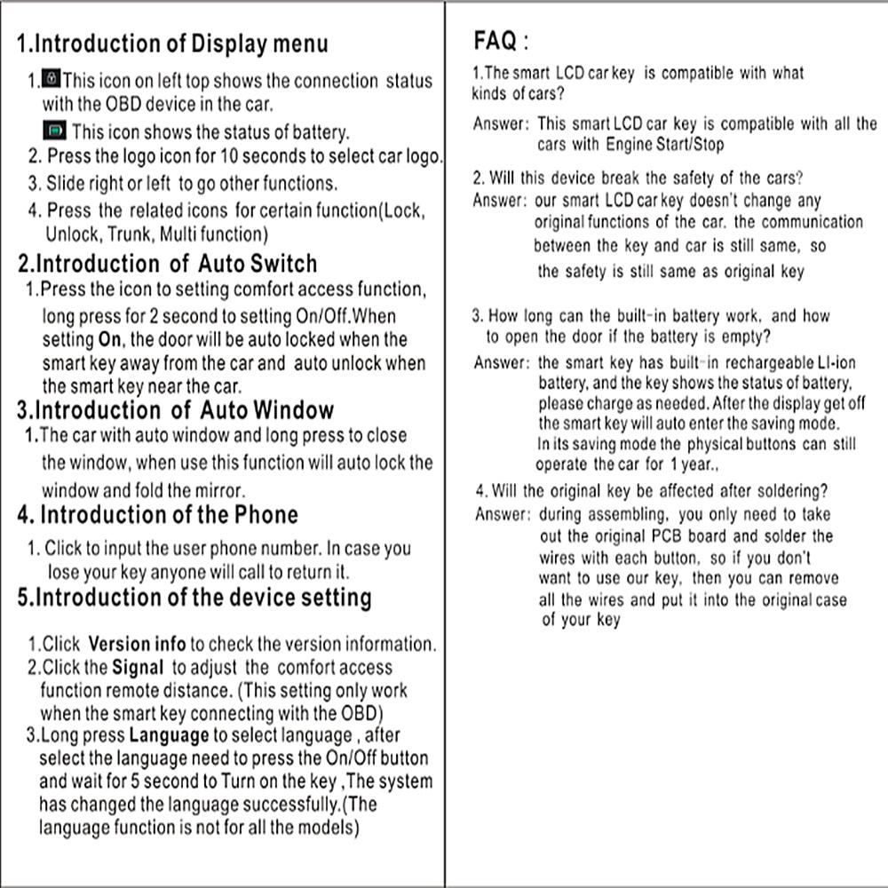 2. Автоматическое поднятие окна. Для моделей, окна которых могут быть подняты автоматически длительным нажатием кнопки блокировки оригинального автомобиля, после установки ЖК-ключа, когда вы покидаете автомобиль, окно будет поднято автоматически после того, как автомобиль будет автоматически заблокирован. (Есть несколько автомобилей, которые несовместимы с функцией автоматического подъема окон, функция нуждается в поддержке вашего автомобиля)