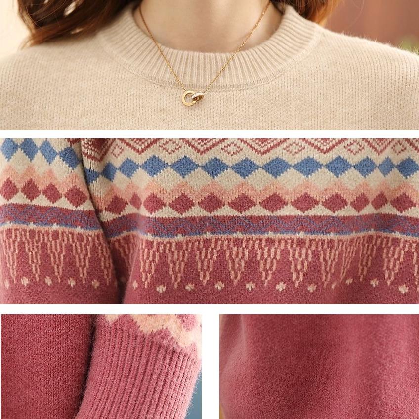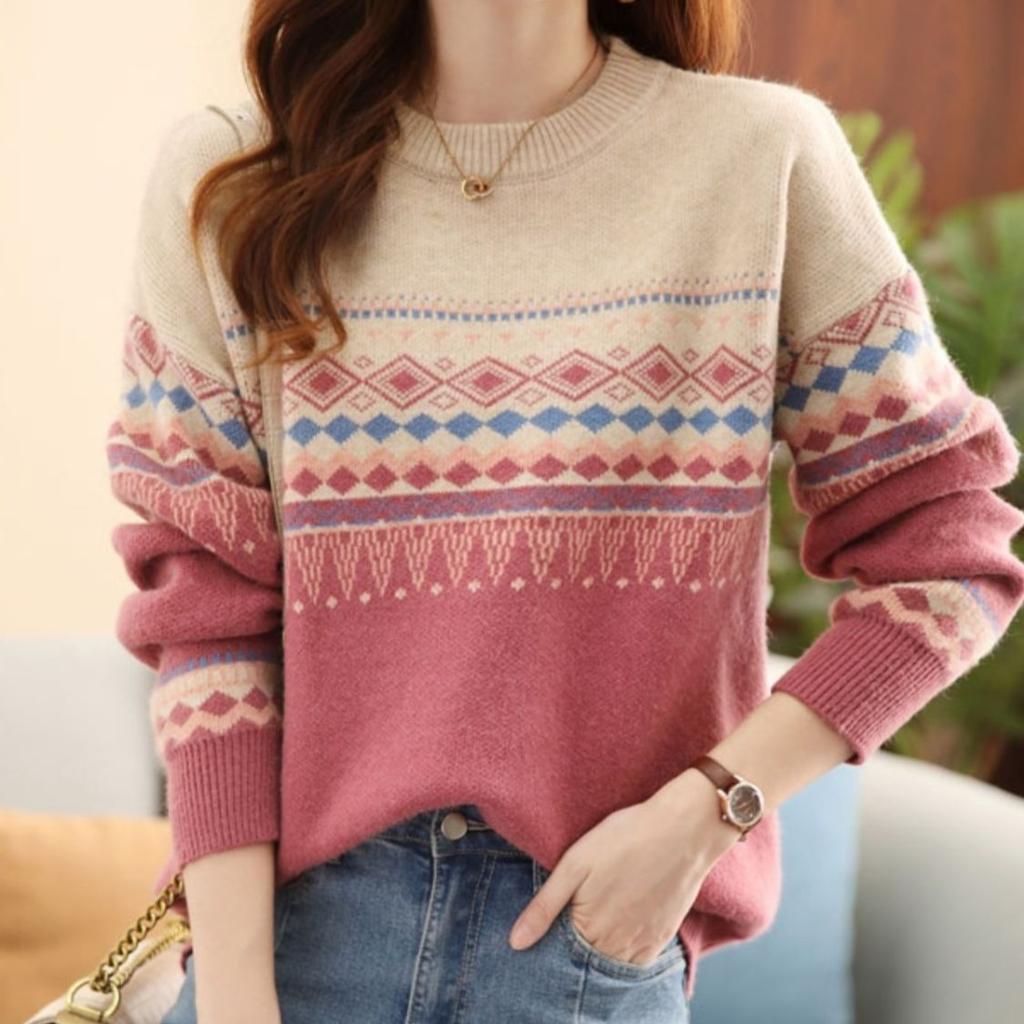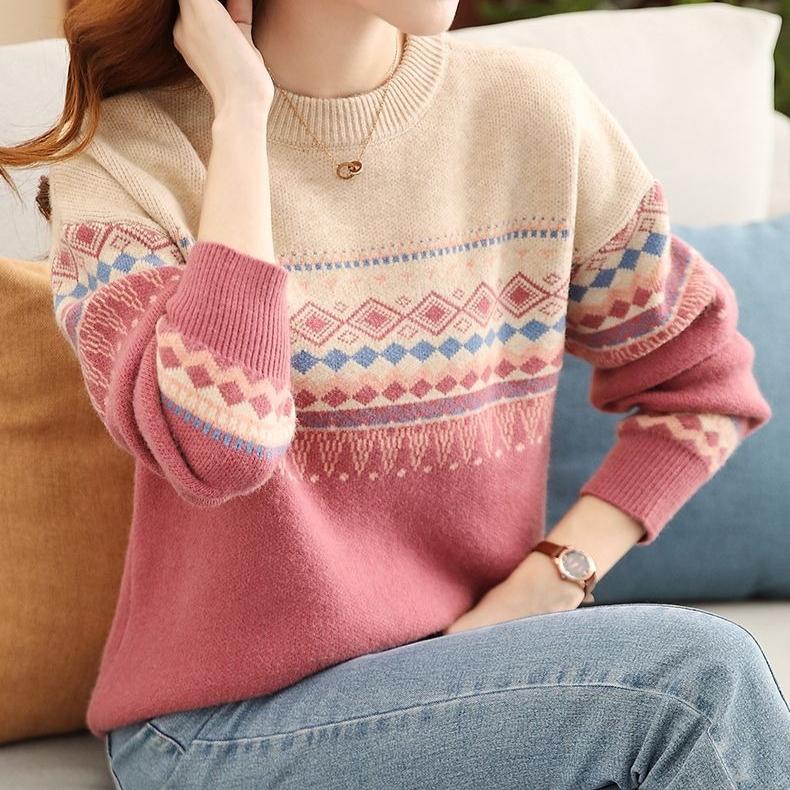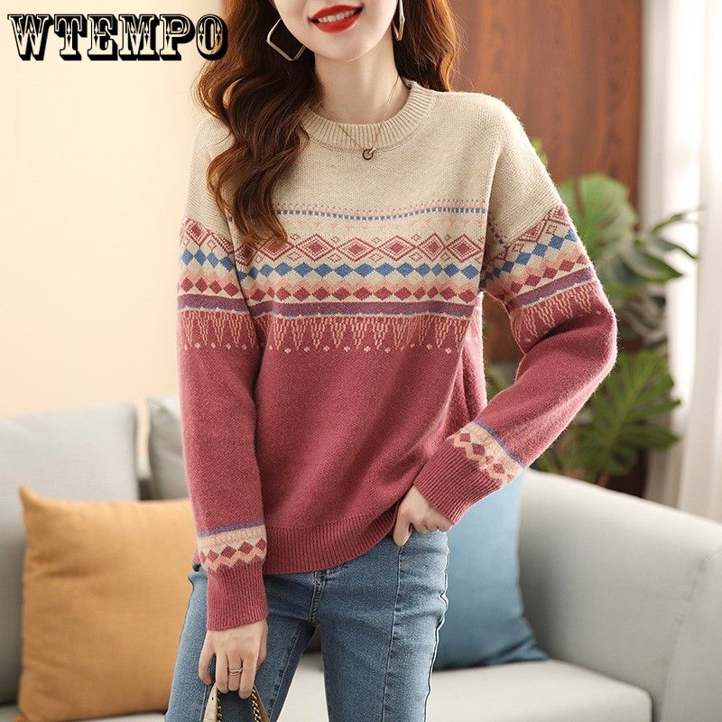 Свитер женский свободный большого размера с круглым вырезом пуловер для женщин вязаный свитер в корейском стиле в стиле ретро с цветными блоками для осени и зимы