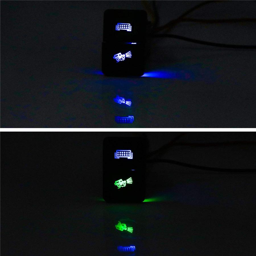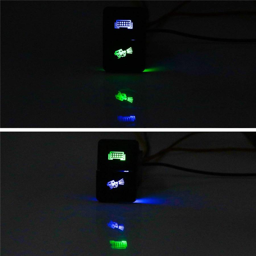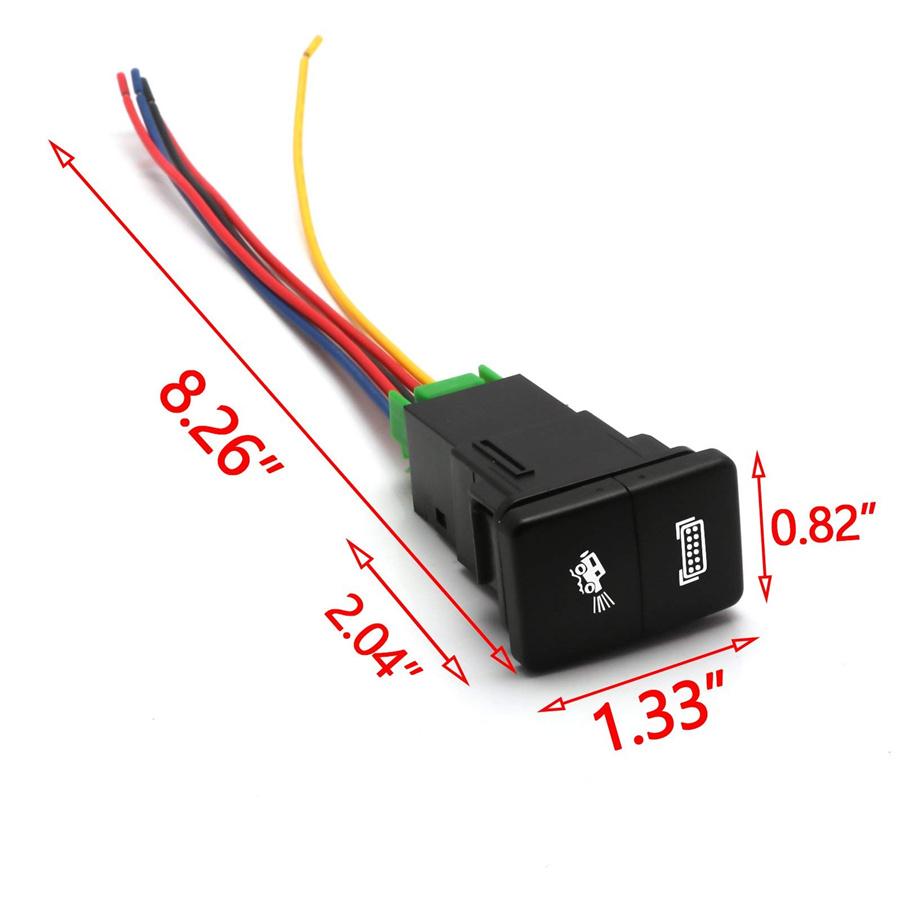 В этом объявлении представлен один комплект спецификаций 33 мм x 21 мм 12 В двухцветный двойной кнопочный переключатель с световой панелью/противотуманной фарой, светодиодной подсветкой фона, совместимый с Toyota и Scion для противотуманных фар, ДХО, светодиодной световой панели и т. д.