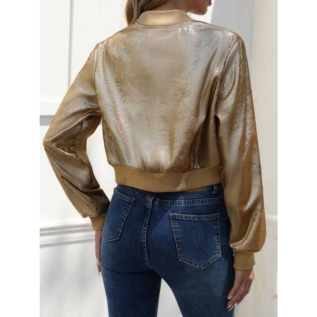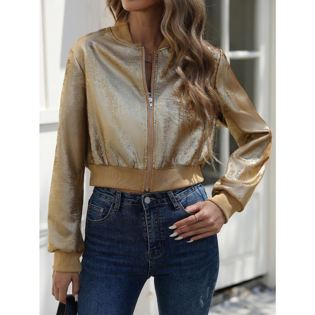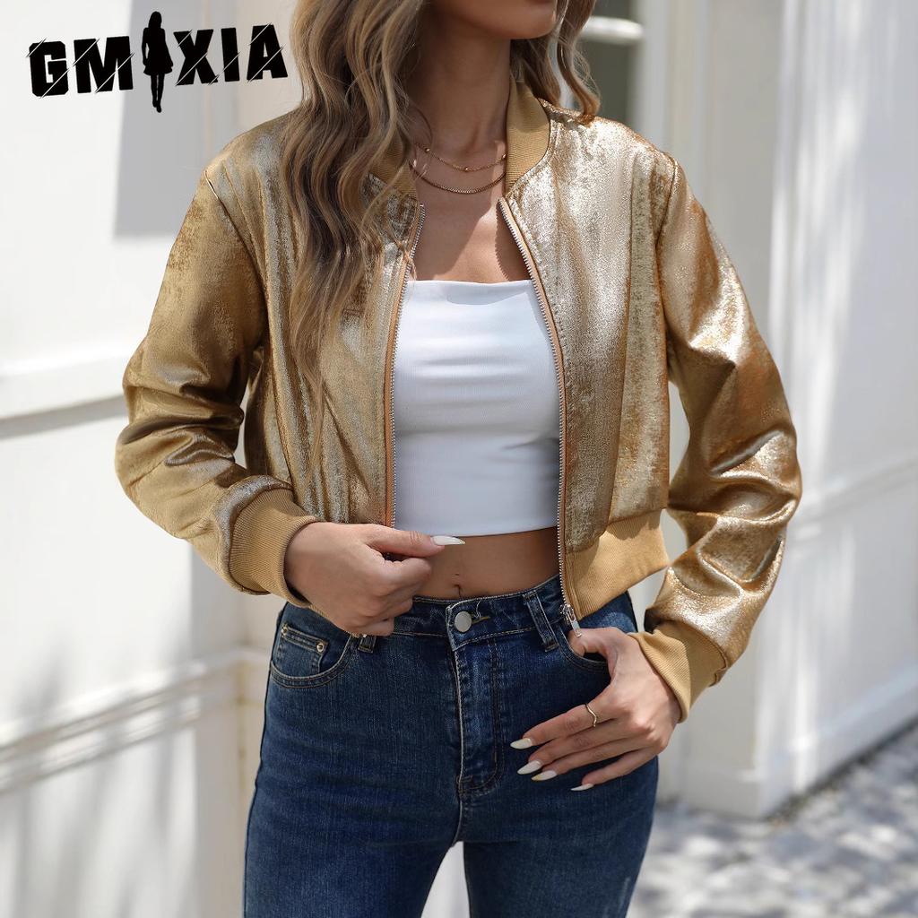 GMXIA Женская весенне-осенняя куртка с длинными рукавами на молнии с золотой фольгой в повседневном стиле