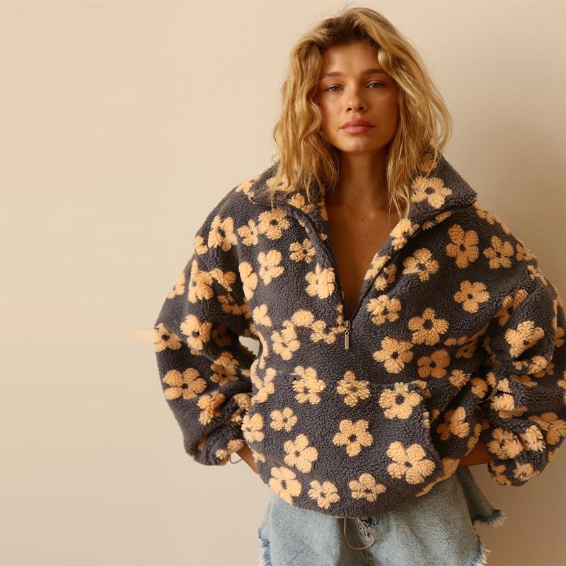 Флисовая толстовка женская с цветочным принтом, теплая, из овечьего флиса, со стойкой воротником, на молнии, свободная, мягкая, пуловер, осень/зима 2025 — купить товар онлайн с бесплатной доставкой по всему миру!