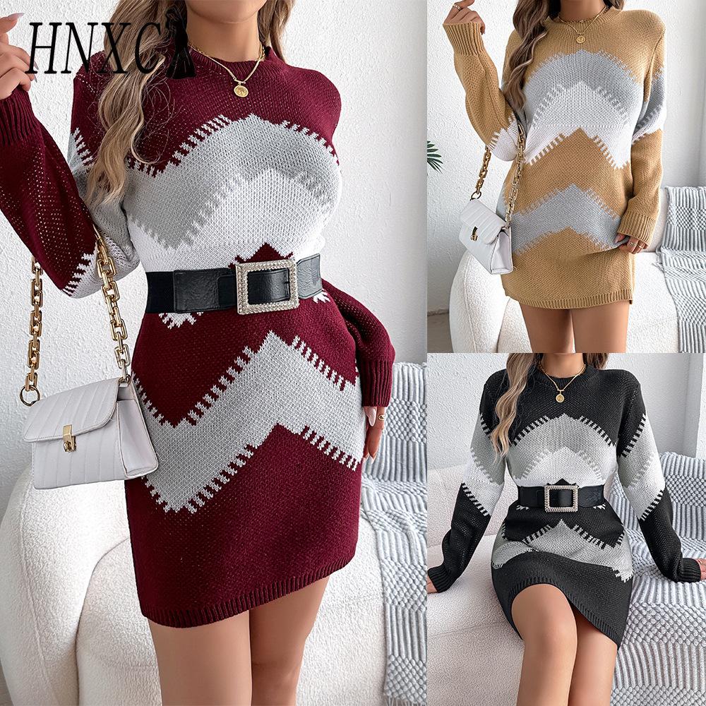 HNXC Осень и Зима Повседневное Многоцветное Платье-свитер с Рукавами-фонариками Женская Одежда Платья-свитера