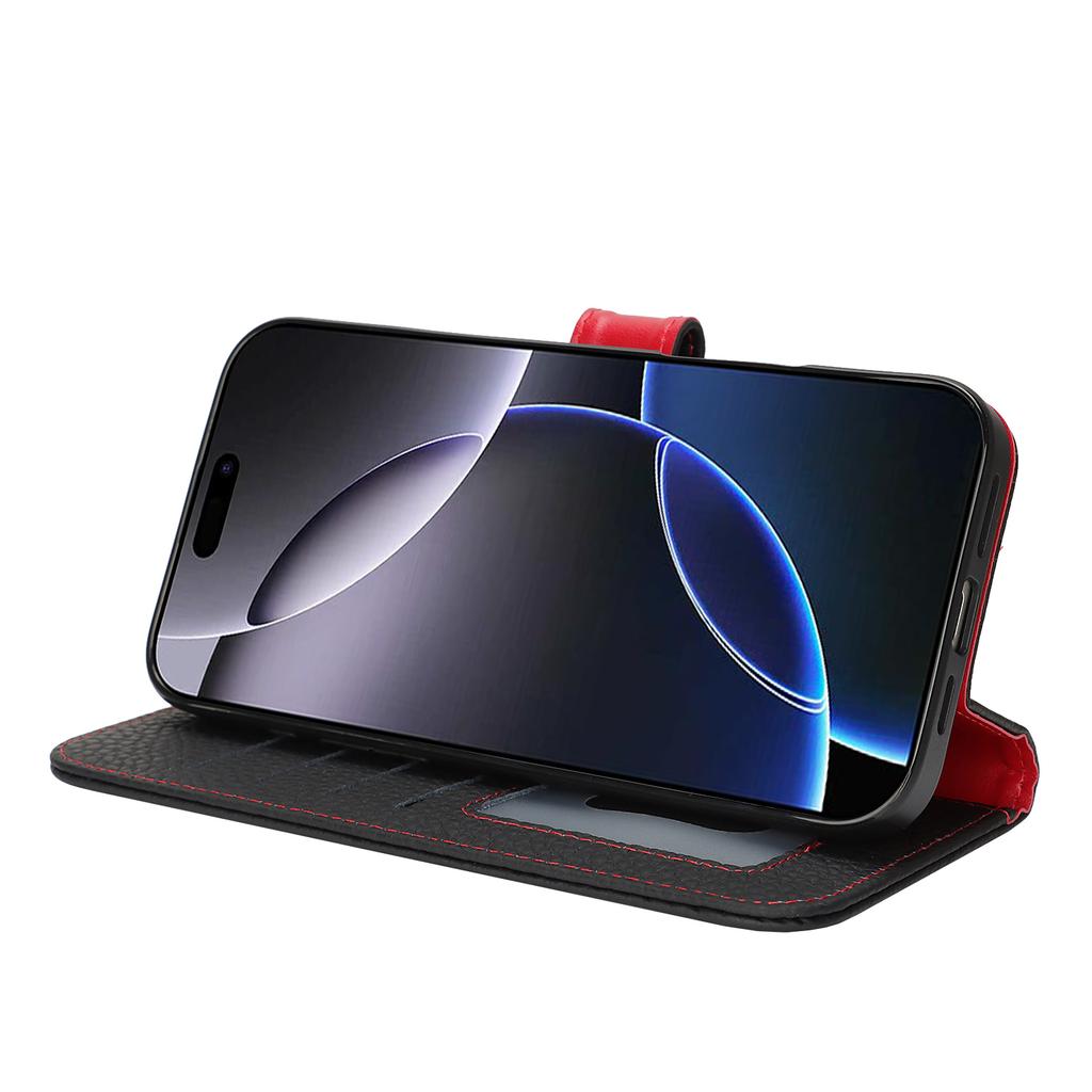 For iPhone 16 Pro Stand Case Litchi Texture Genuine Cow Leather Wallet Phone Cover RFID Blocking