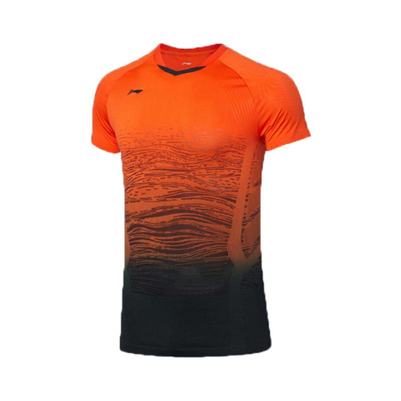 Li-Ning Легкая рубашка для бадминтона с коротким рукавом и V-образным вырезом Color Block, мужские топы, оранжевый AAYP329-2