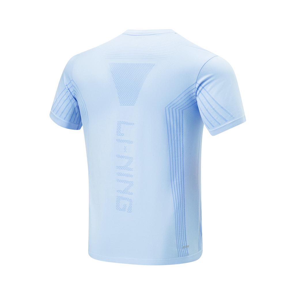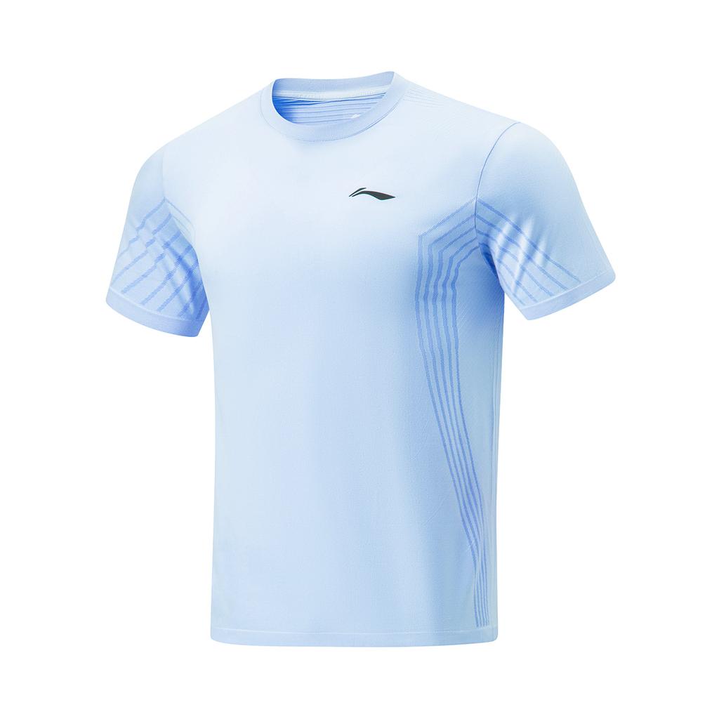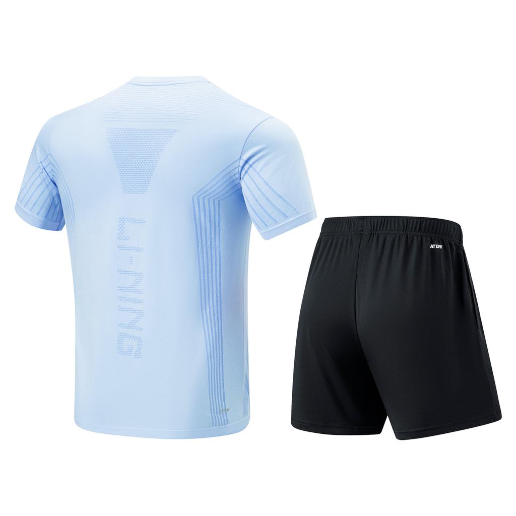 Li-Ning Футболка с круглым вырезом, полосатая, с коротким рукавом и однотонные эластичные шорты, повседневный спортивный комплект, комплекты унисекс, цвет Ice-River-Blue, черный AATU015-2