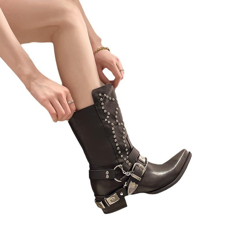 Остроносые Горячие Ботинки на Грубом Каблуке Рыцарские Ботинки Черные Панк Стиль Нишевые Ботинки Ботинки в Стиле Пустоши Женские Ретро