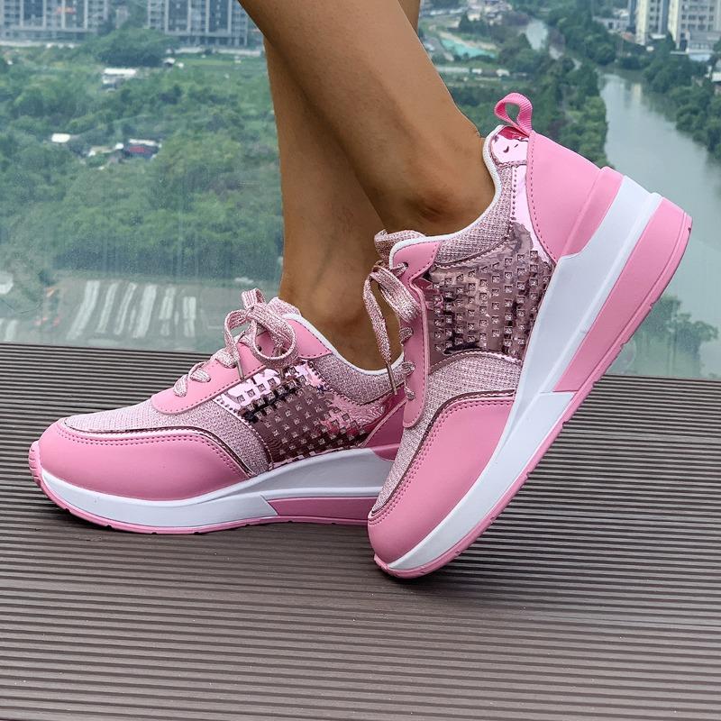 Женские кроссовки на платформе с танкеткой большого размера, дышащие, с пайетками, с круглым носком, на шнуровке, новые повседневные кроссовки весна-осень