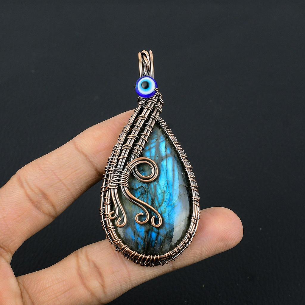 Labradorite Pendant, Handmade Gemstone 999 Copper Wire Wrapped Evil Eye Pendant Antique Jewelry, For Gift Silver Jewelry
