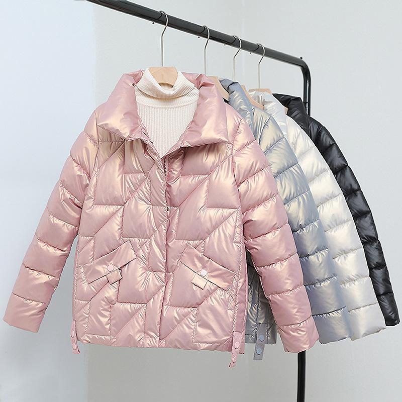 Женская куртка Зимние парки Женские глянцевые пуховые хлопковые куртки Стойка воротник Повседневная теплая парка Короткое пальто Женская верхняя одежда