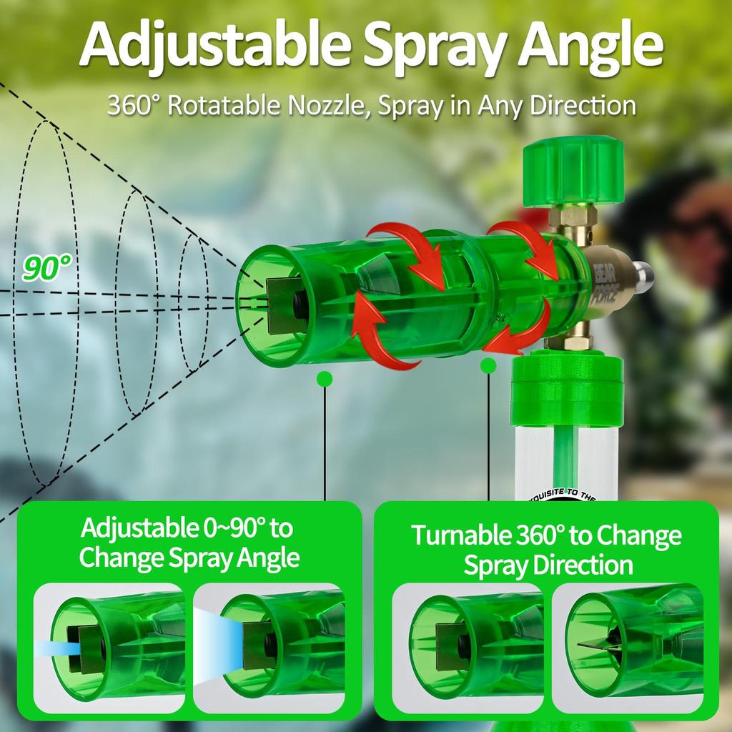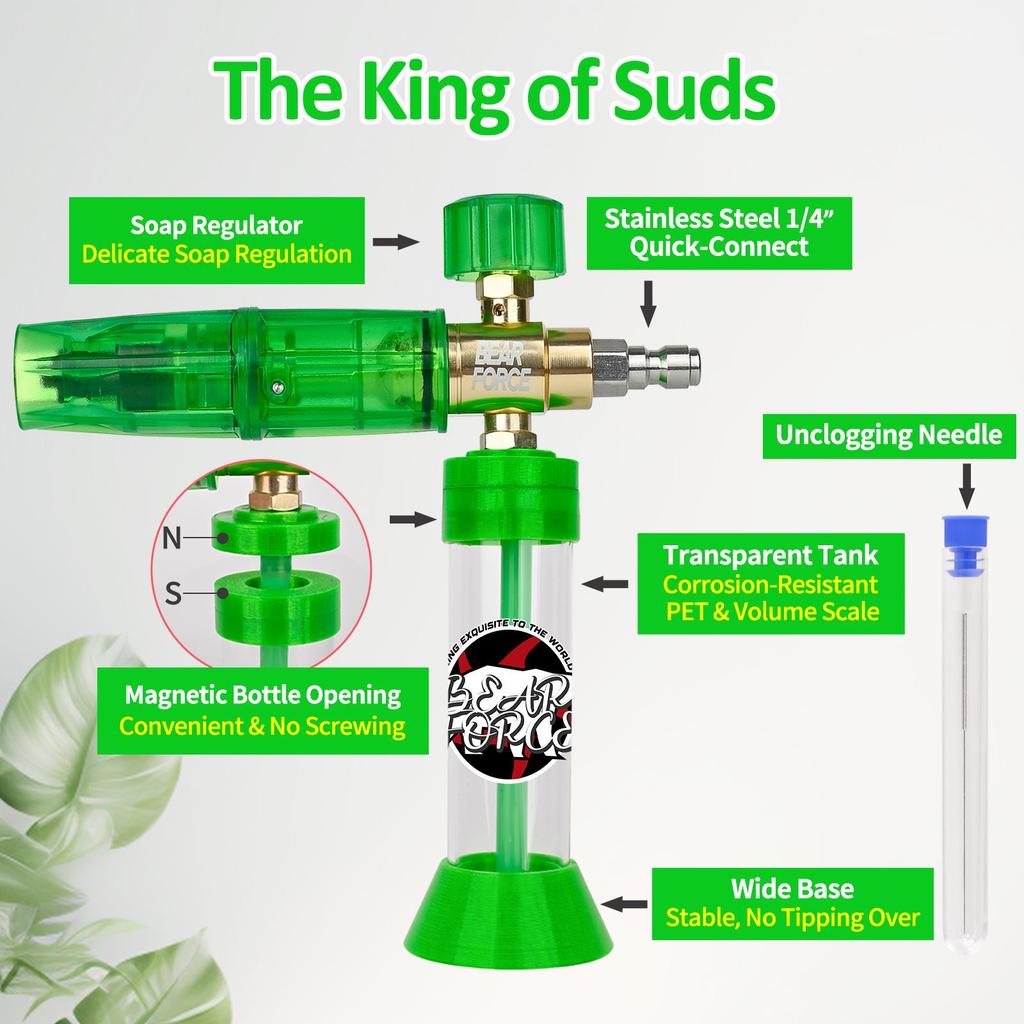Регулируемая пенная насадка BEAR FORCE, всего одно быстрое нажатие, чтобы заполнить концентрат за секунды! Корпус бутылки был полностью модернизирован для исключительной прочности, долговечности и ударостойкости — разбавление не требуется, поэтому вы можете добавлять концентрат напрямую для получения богатой, плотной пены, что делает ваше использование ультраудобным. Благодаря простому управлению и конструкции с магнитной крышкой, вы можете открыть его и сразу добавить концентрат, чтобы удвоить эффективность очистки, позволяя вам без труда наслаждаться пенообразованием профессионального уровня.. В комплекте фитинг-быстросъем 1/4" и регулируемая насадка.