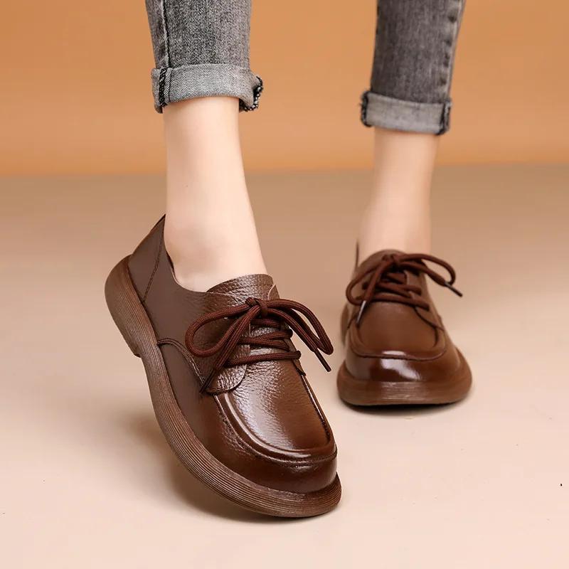 Модная весенняя новинка женская обувь натуральная кожа ретро мода лоферы мягкая подошва британская удобная шнуровка противоскользящая повседневная обувь 2025