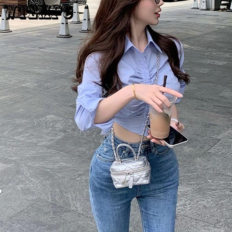 WTEMPO Сексуальные укороченные топы, модные блузки для женщин, туника со складками, повседневные рубашки с длинными рукавами, новинка в Корейском стиле, черно-белые футболки Y2K