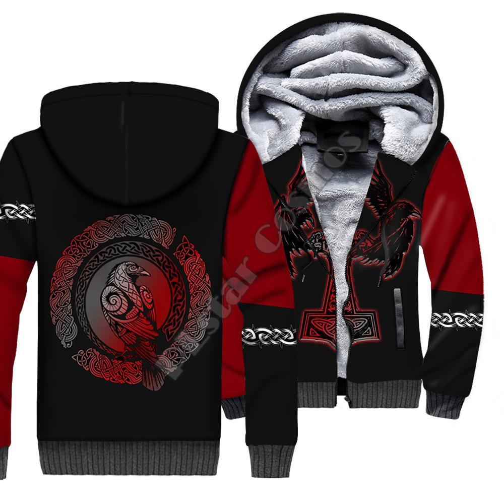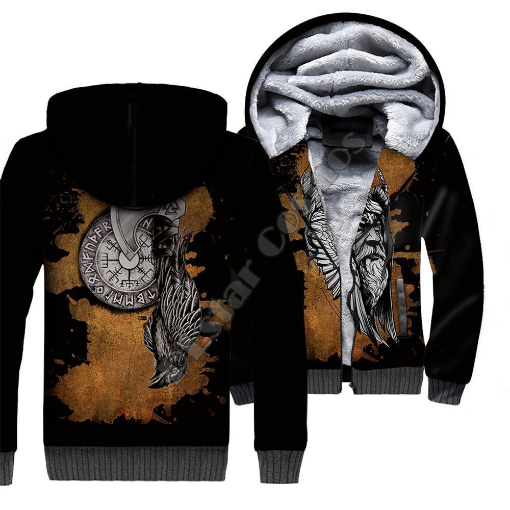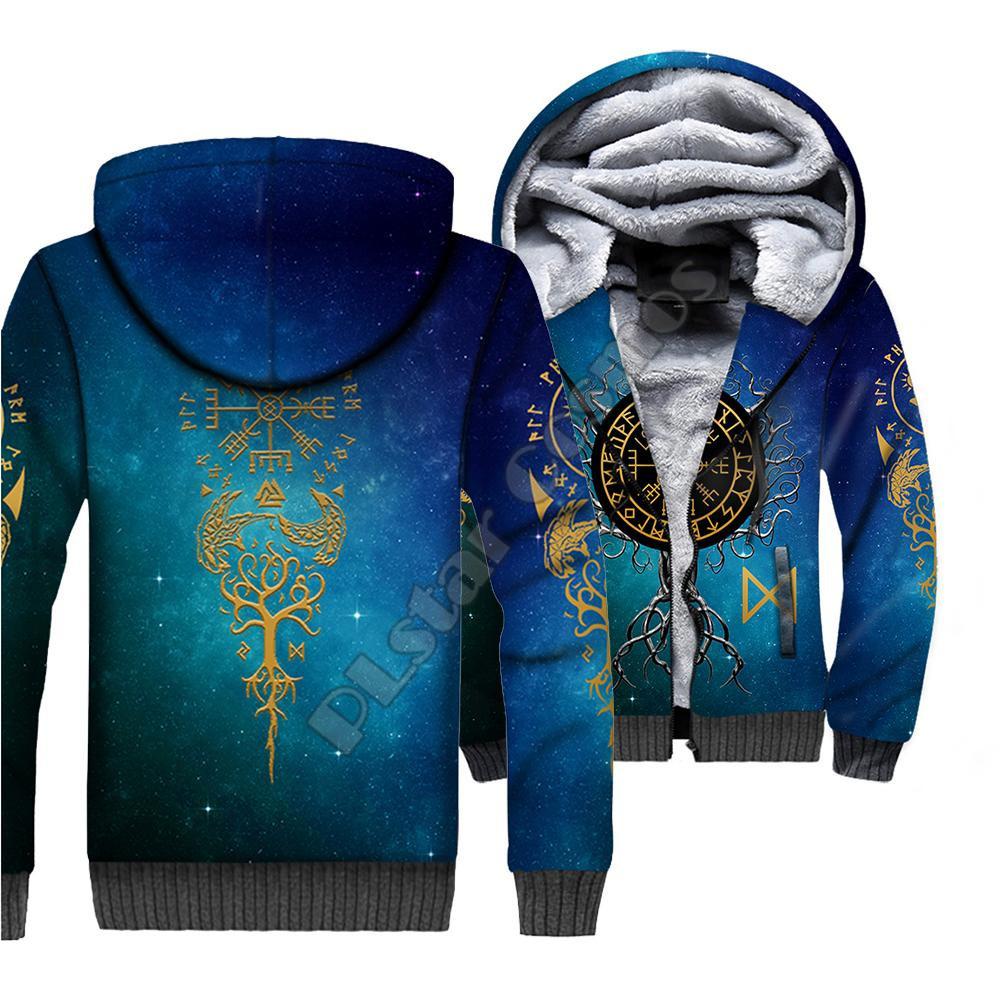 Мужская толстовка из флиса с капюшоном на молнии с 3D-принтом татуировки викингов, двухслойная