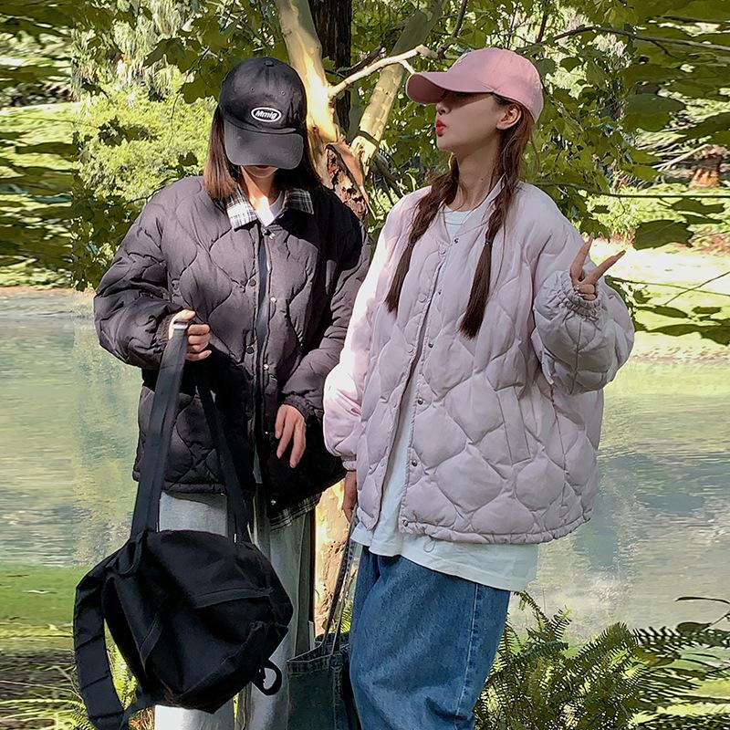 Новая тонкая куртка с хлопковой подкладкой Осень и Зима Короткая с крупным ромбовидным узором Без воротника Куртка с хлопковой подкладкой Куртка для пар