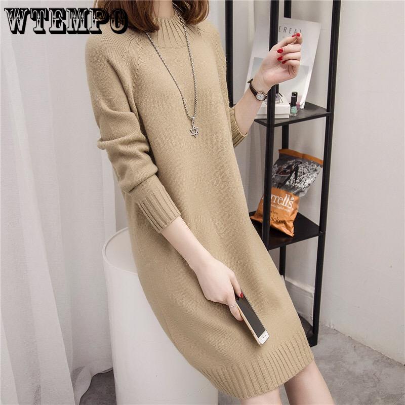 Вязаное платье для женщин Свободное средней длины Свитер в корейском стиле Однотонный Повседневный Пуловер с полувысоким воротником Осень и Зима — купить товар онлайн с бесплатной доставкой по всему миру!