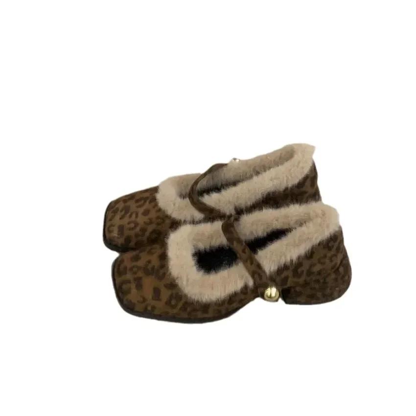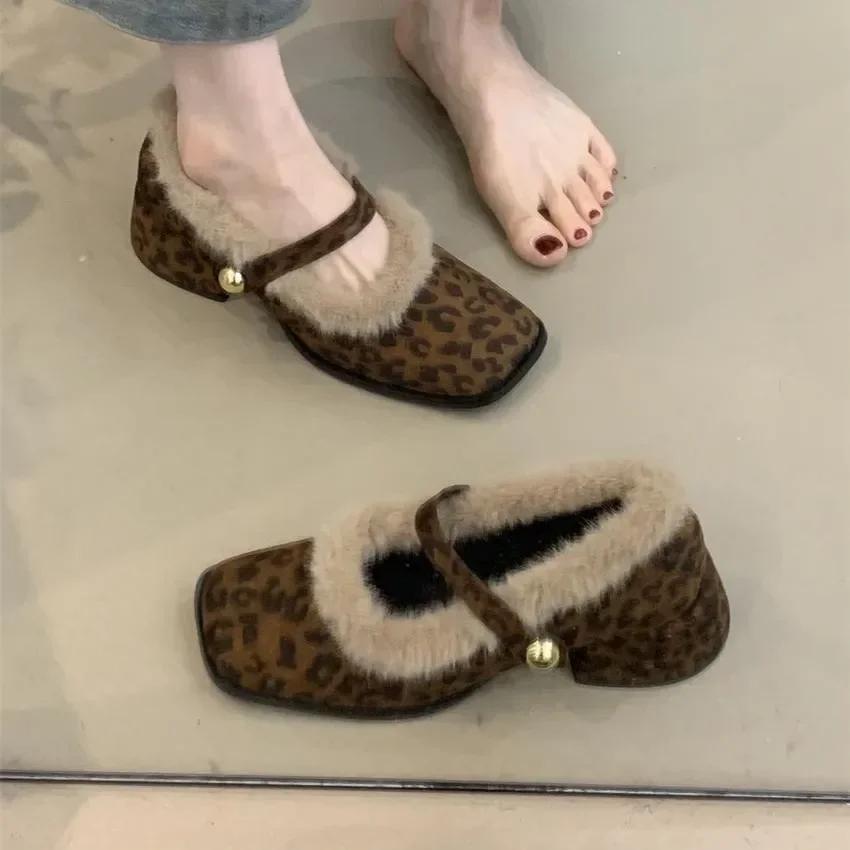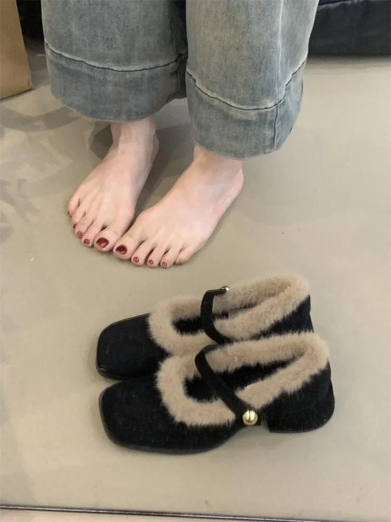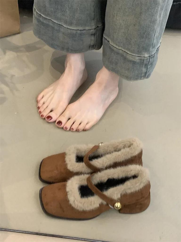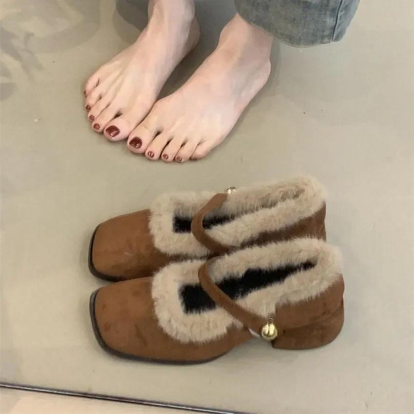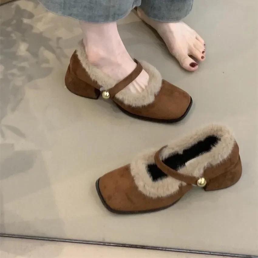 Модная обувь Мэри Джейн на толстом каблуке с сумкой на носке, 2025 новинка, элегантные замшевые туфли с французским темпераментом, плюшевые ленивые пушистые туфли