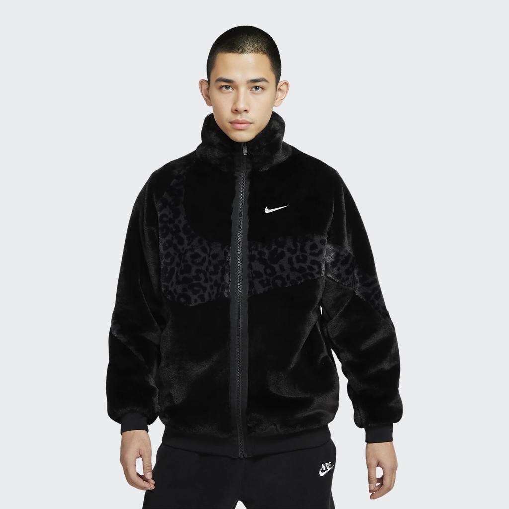 Nike Спортивная одежда Swoosh с леопардовым принтом и большим логотипом на крючках, велюровая спортивная куртка из искусственного меха, мужская верхняя одежда, черный DH6685-010