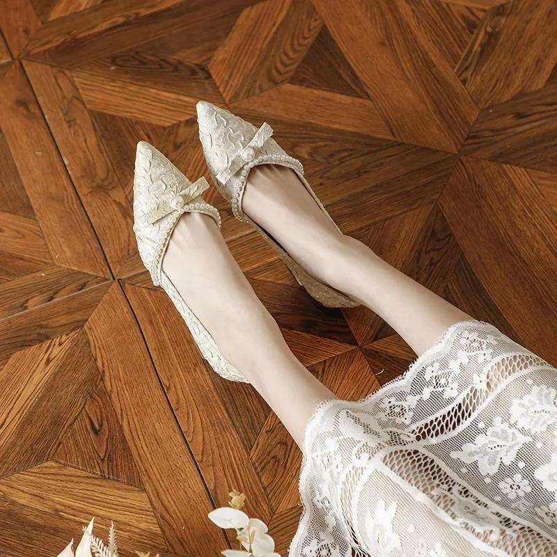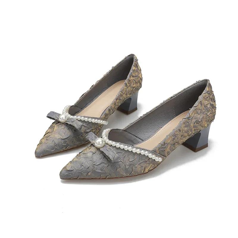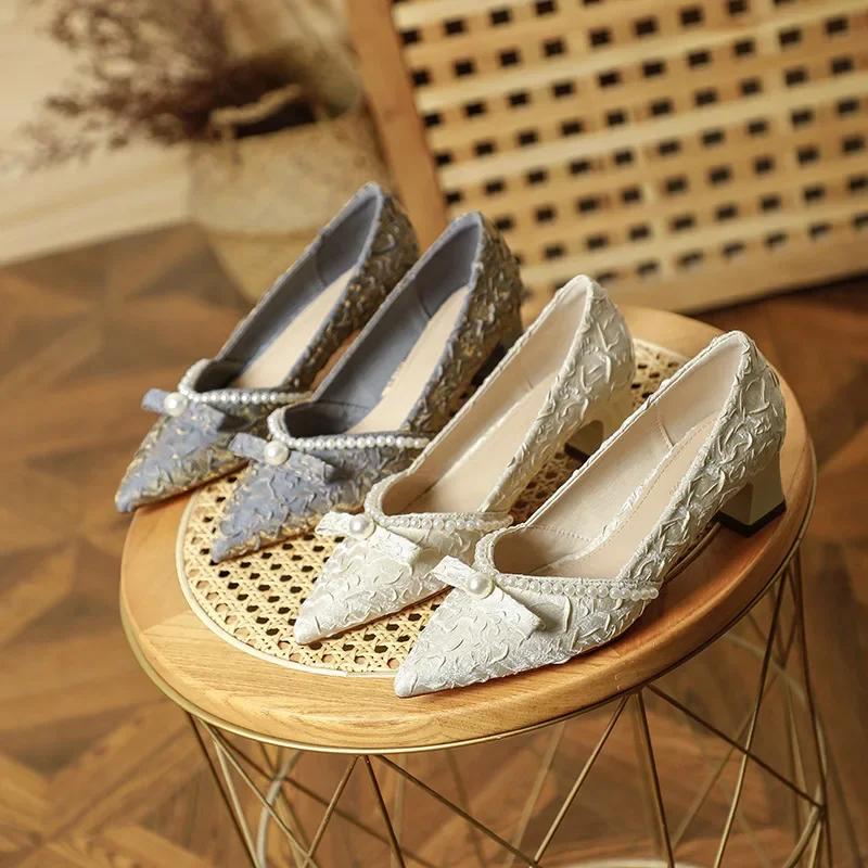 Fashion Single Shoes Women's Middle Heel Satin Pearl Bow Women's Shoes Spring 2025 New Light Mouth Pointed Thick Heel High Heels