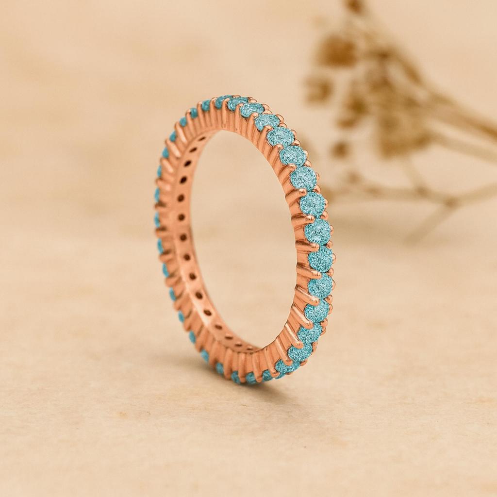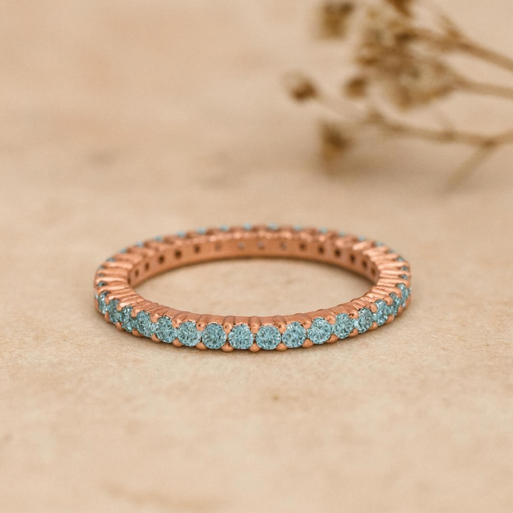 Круглое кольцо-дорожка с аквамаринами – Покрытое розовым золотом серебро 925 пробы, кольцо «полная бесконечность» – Кольцо на годовщину свадьбы с синим драгоценным камнем