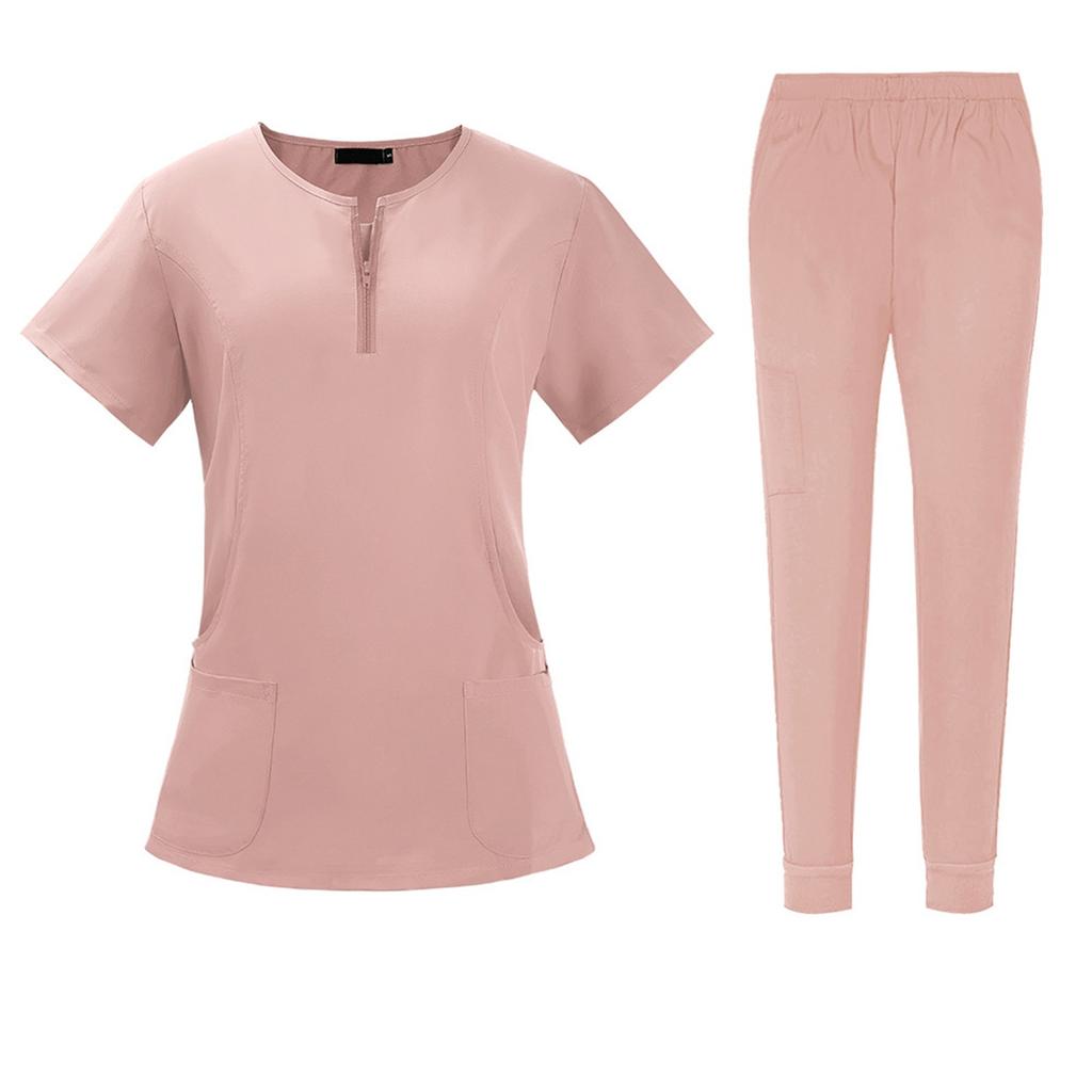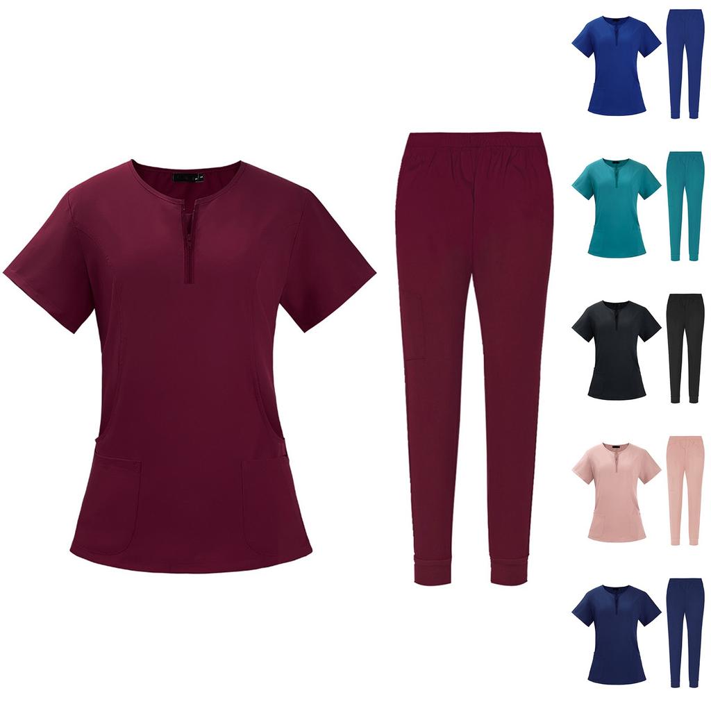 Женский быстросохнущий однотонный комплект брюк с короткими рукавами и косым воротником, карманами, рабочая одежда