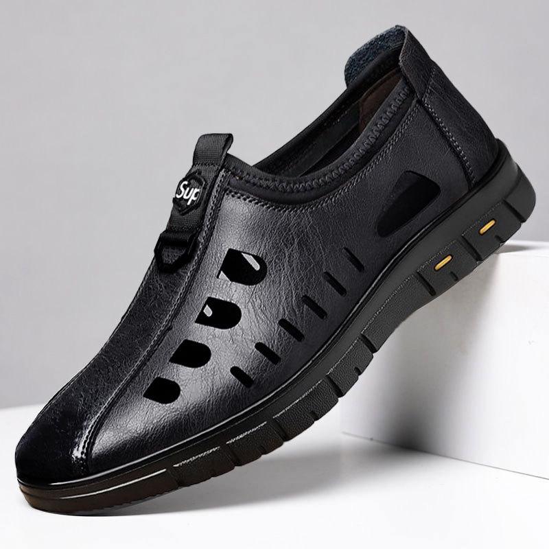 Fashion Men Leather Shoes Slip on Comfortable Casual Flats Fashion Breathable Dress Shoes Male Loafers Men Hollow Outdoor Beach Sandals