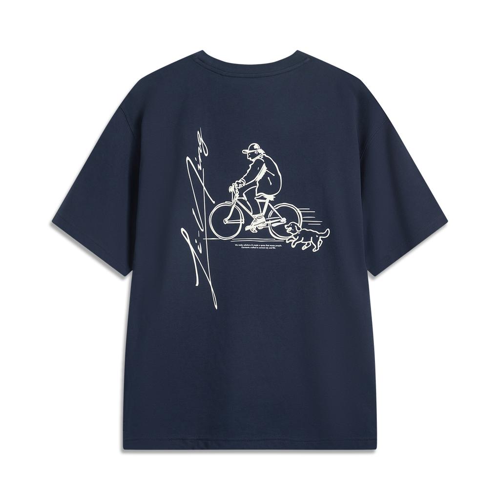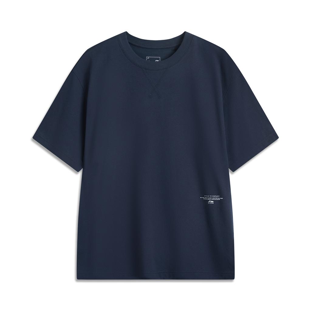 Li-Ning Удобная Повседневная Простая Влагоотводящая Футболка с Принтом, Со Спущенным Плечом, Свободного Кроя, с Коротким Рукавом, Унисекс, Топы, Насыщенный Темно-Синий AHSV177-4