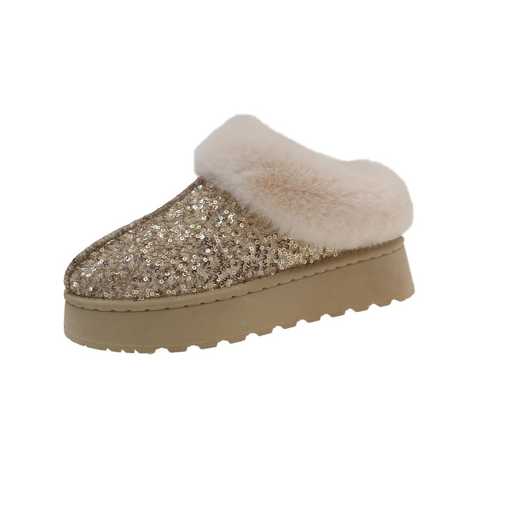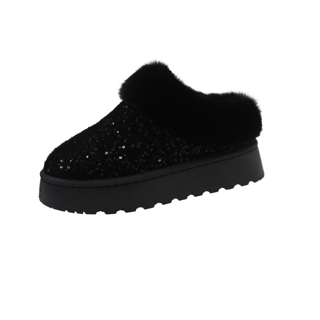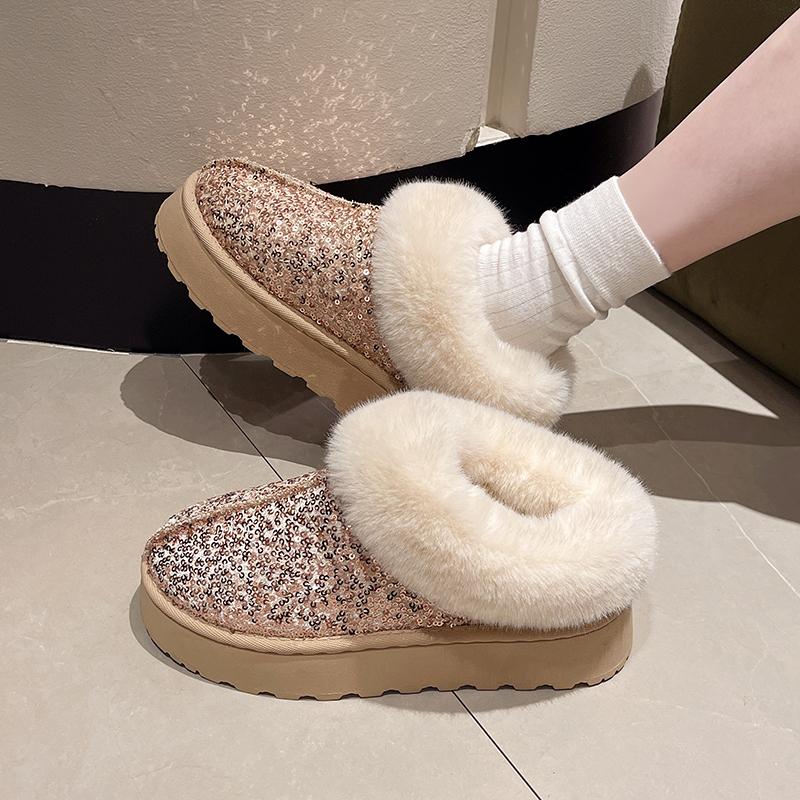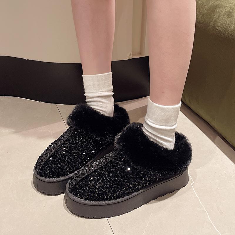 Модные зимние новые туфли-лодочки с круглым носком и глубоким вырезом, с пайетками, из шерсти, теплые, нескользящие, износостойкие, на плоской подошве
