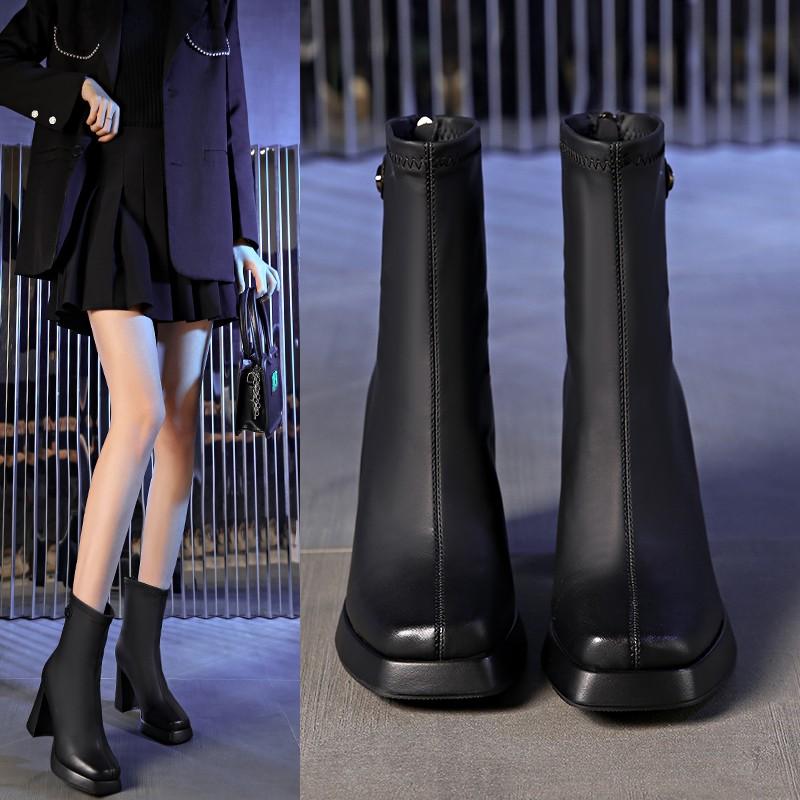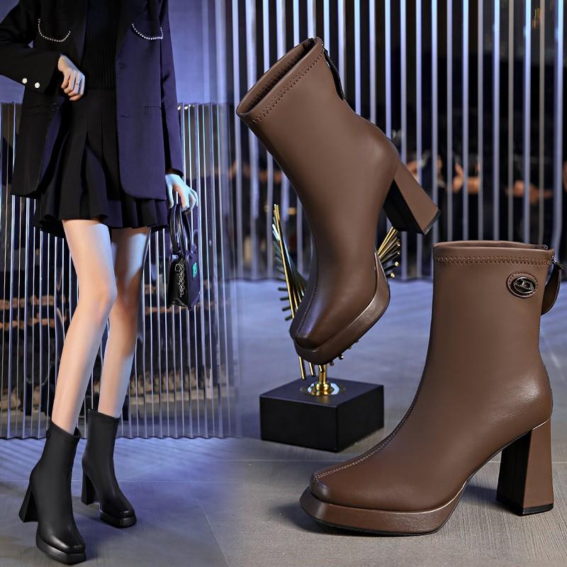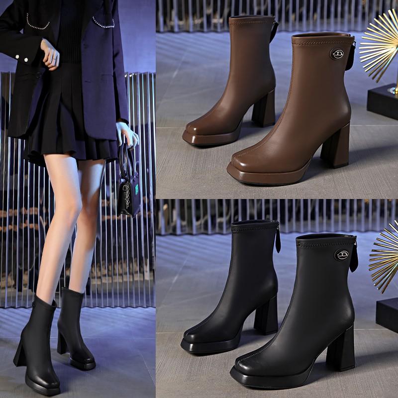 Модные женские ботинки Модные ботинки Задняя молния Осень Женская обувь на высоком каблуке Горячие продажи Дизайнерские ботильоны Большой массивный каблук