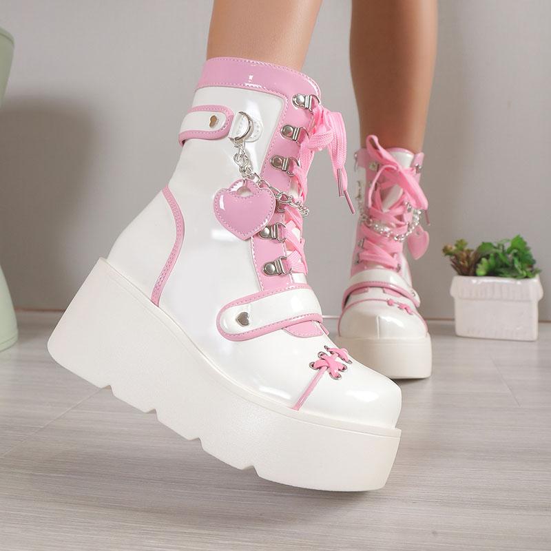 Модная обувь Comemore Женские туфли на платформе Ботинки Лолита Женские туфли на танкетке Женские полусапожки до середины икры Готические Розовые Каваи JK Косплей Длинные Боты