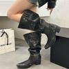 Мода Новые Популярные Туфли для Женщин Сапоги до Колена Красные Черные Белые Высокие Сапоги Женские Плиссированные На Низком Каблуке Повседневные Кожаные Женские Длинные Туфли