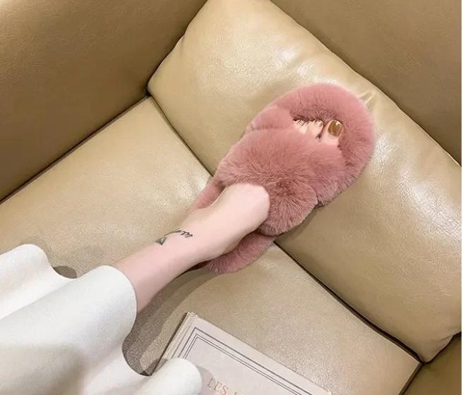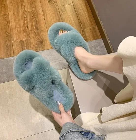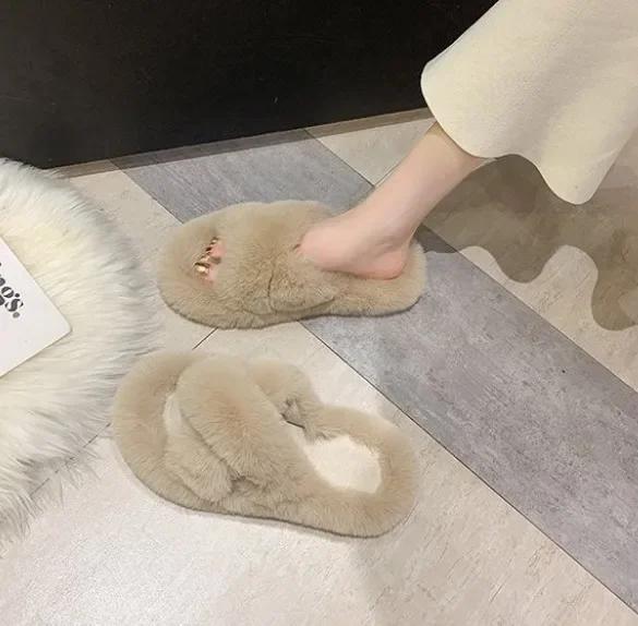 Мода Мода Одно слово Тапочки из толстого меха Тапочки из двойного меха Повседневная домашняя хлопковая обувь для женщин Плоские плюшевые тапочки с перекрещенными ремешками 2024