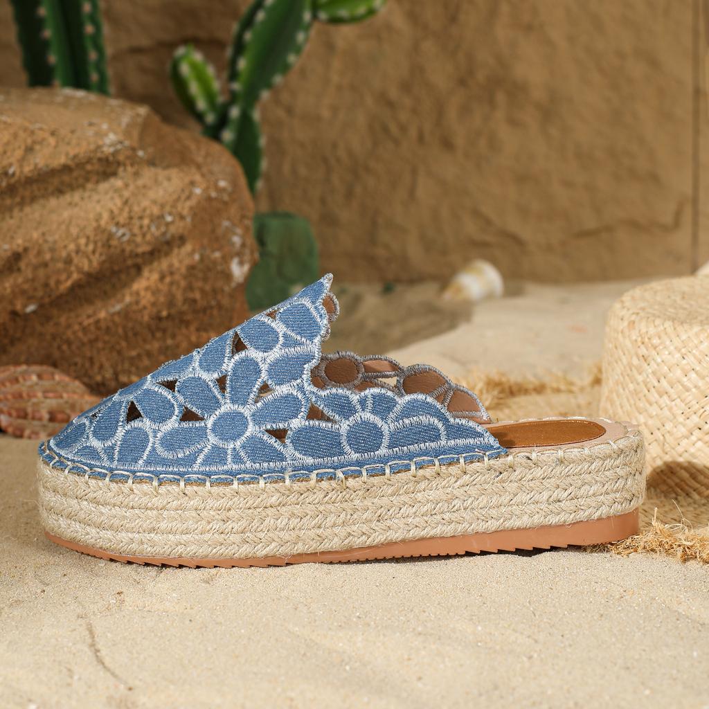 Мода Размер 36 41 Балетки Женские тапочки Женские летние шлепанцы Ажурные плетеные пеньковые Толстый каблук Лоферы Закрытый носок Сандалии Сандалии женские