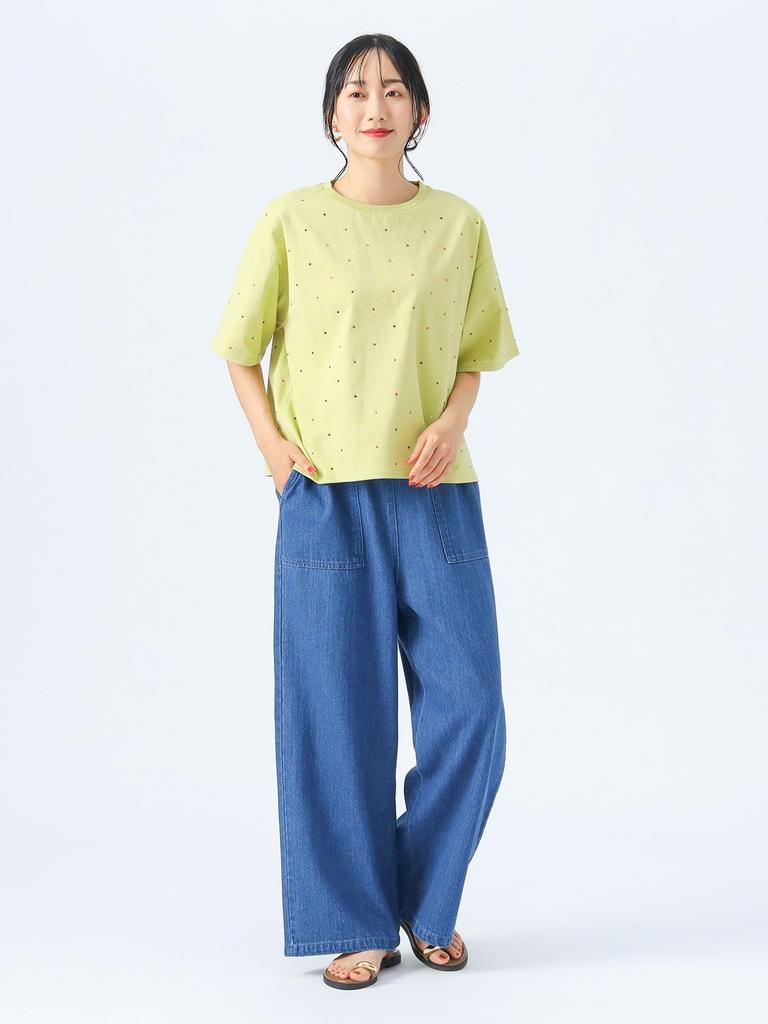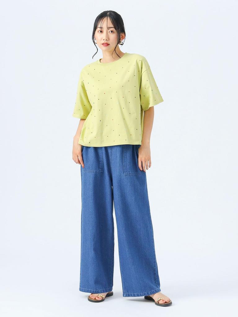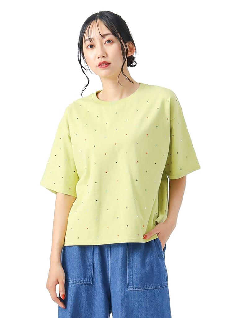 A versatile item that can be coordinated with both casual and elegant styles. When worn under a jacket, the stones subtly sparkle with every movement, making it a statement piece even when worn as an inner layer. It is also recommended as an inner layer for a cami dress for a trendy look.