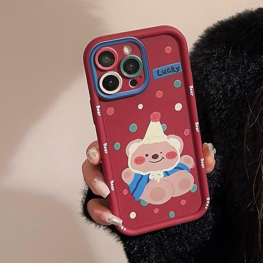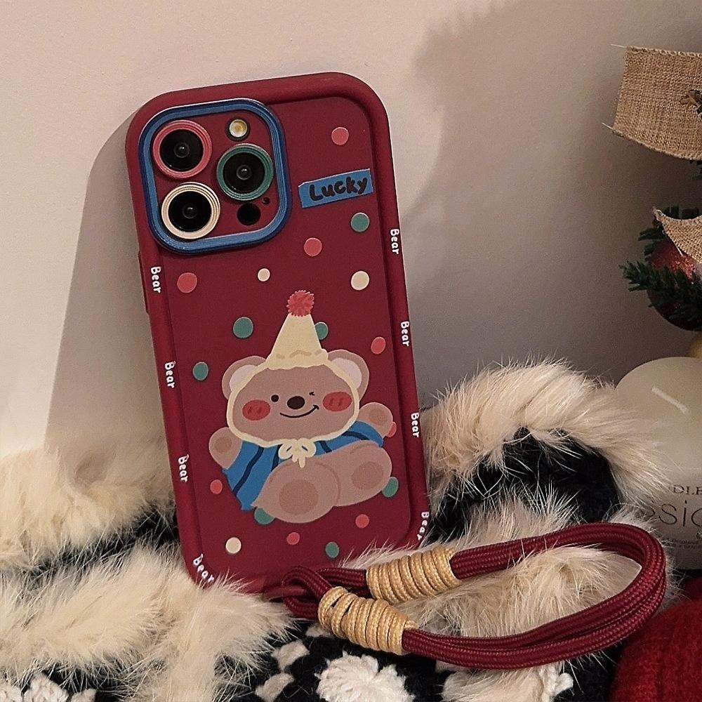 Korean Style Bear Lanyard IPhone 17 Apple Phone Case 14pro Burgundy 11 Suitable for 13 Matte 16 Full Cover X