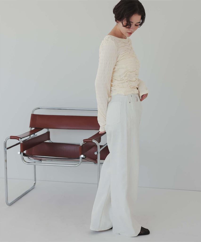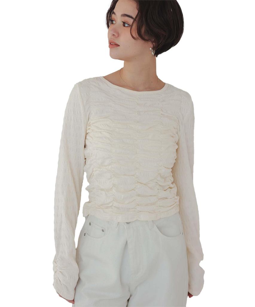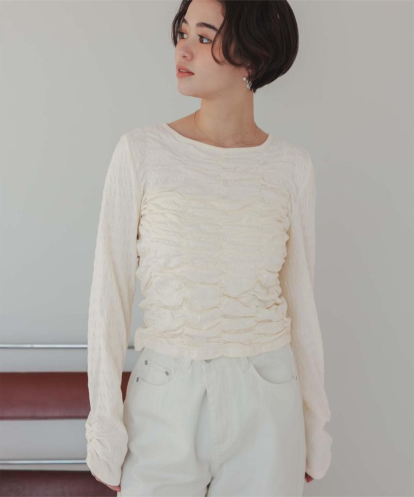 This long-sleeve top features a gorgeous shirred design. Key Points: ・The shirred design looks stunning on its own: The three-dimensional shirring adds a simple yet striking touch. ・Can also be used as a layering piece: A versatile piece that can be worn alone or layered. ・Cloth material: Stretchy, comfortable, and easy to move in. Coordination: ・Casual style: Pair with jeans or wide-leg pants for a relaxed look. ・Layered style: Convenient as an inner layer under a shirt or jacket, and perfect for layering in cold weather. ・Simple look: Pair with simple bottoms to highlight the shirred design. This versatile piece is perfect for a wide range of occasions, from everyday wear to the office. *Due to the machine production process, there may be some slight variations in the shape, size, and pattern, as well as seams from the weaving process. *Please note that measurements are taken based on actual measurements, so there may be slight variations in size. Due to the manufacturing process, each measurement may be approximately -3cm from the actual size (laid flat).