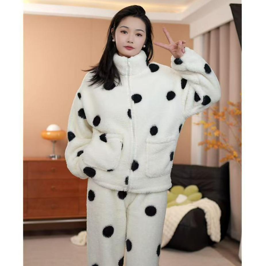 Женская пижама коралловая зимняя в горошек на молнии плюс бархат утолщенная фланелевая домашняя одежда теплый костюм воротник-стойка