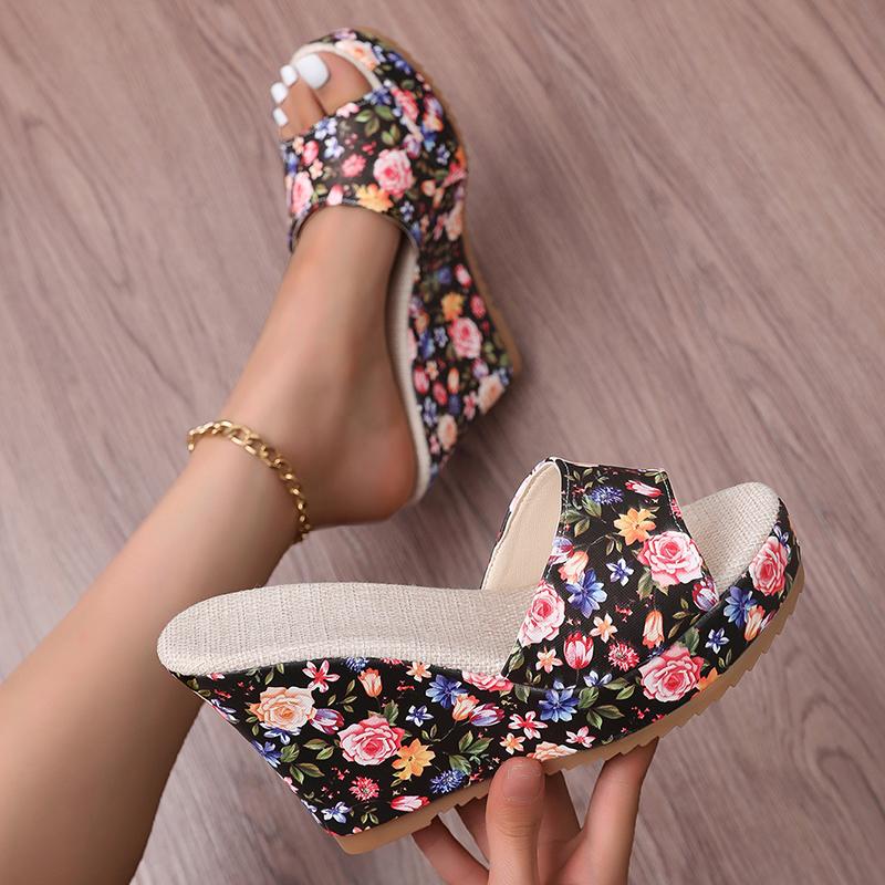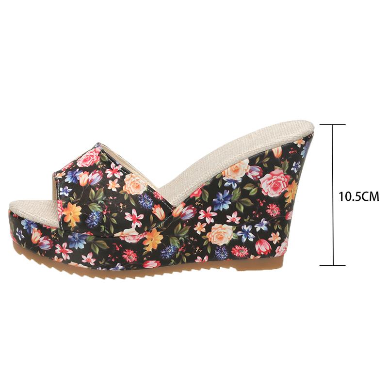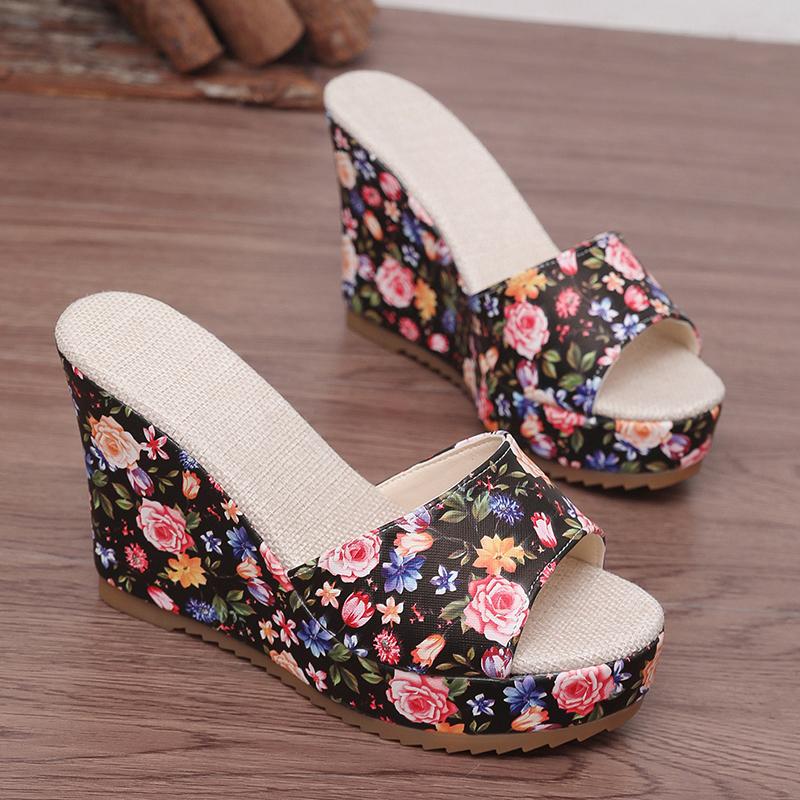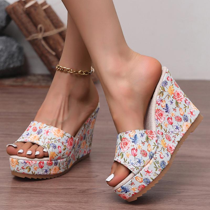 Модные шлепанцы на танкетке с цветочным принтом женские, шлепанцы на массивной платформе, женские летние 2025, толстая подошва, нескользящие, для улицы