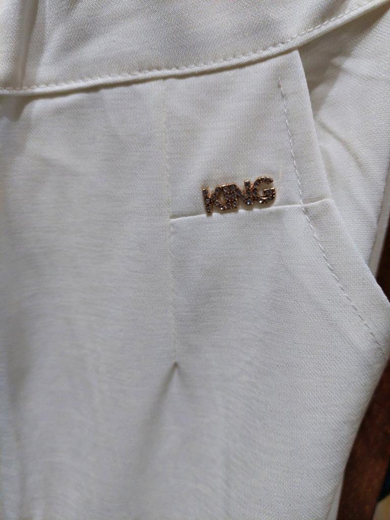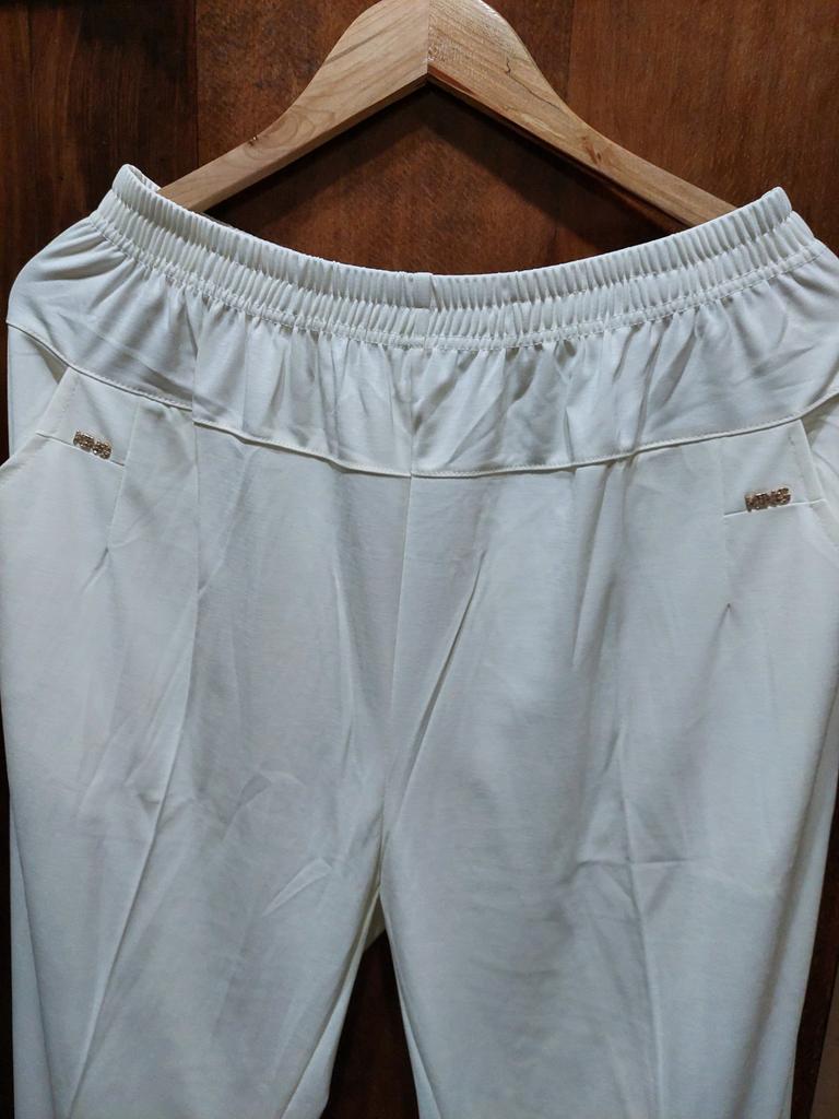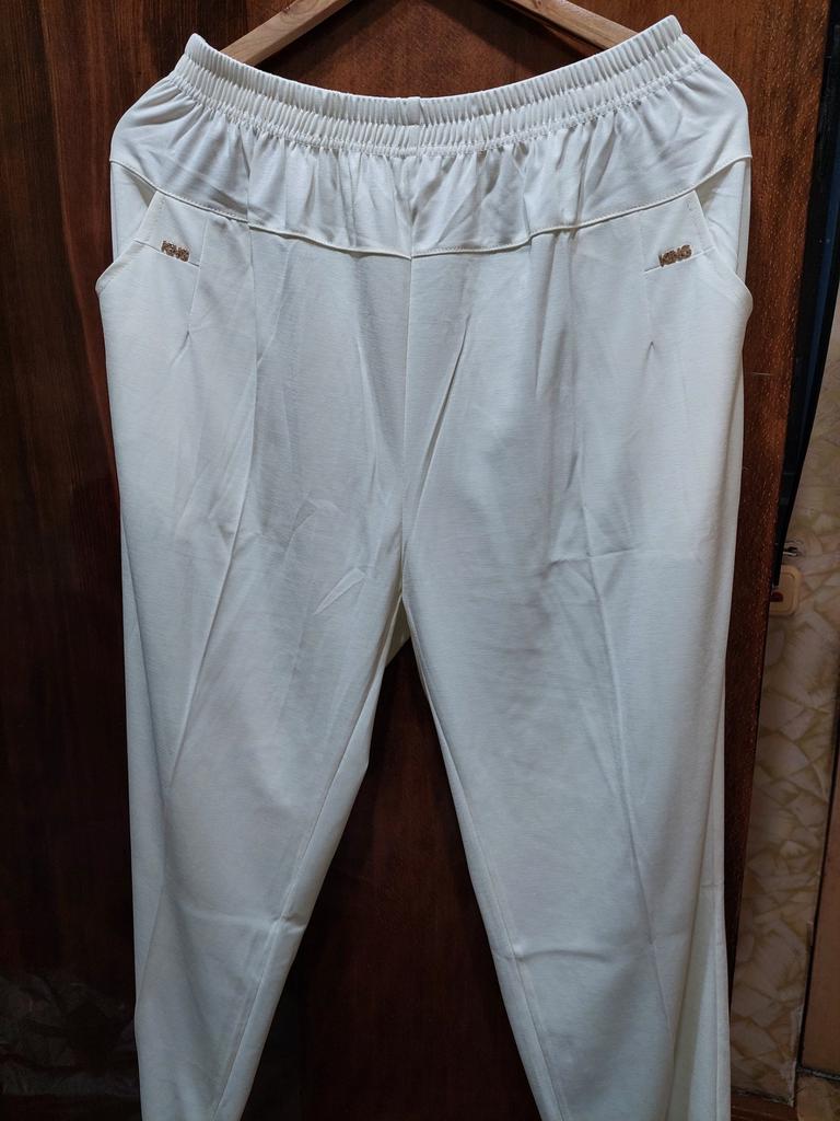 Брюки в белом цвете очень удобные,верх на резинке,посадка высокая,книзу слегка заужены,имеются боковые карманы,на карманах имеются металлические украшения со стразиками-King, ткань синтетика-холодок,струящаяся, приятная к телу.Размеры:длина -100см,резинка-76см,тянется до 130см,вбедрах-130см.На56размер подошли 8 хл.Брючки мне понравились,рекомендую к покупке.Спасибо Джум!❣️