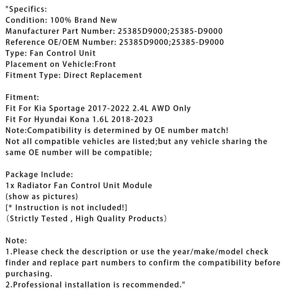 Модуль управления вентилятором радиатора для Hyundai Kona 1.6L Kia Sportage 2.4L 25385D9000