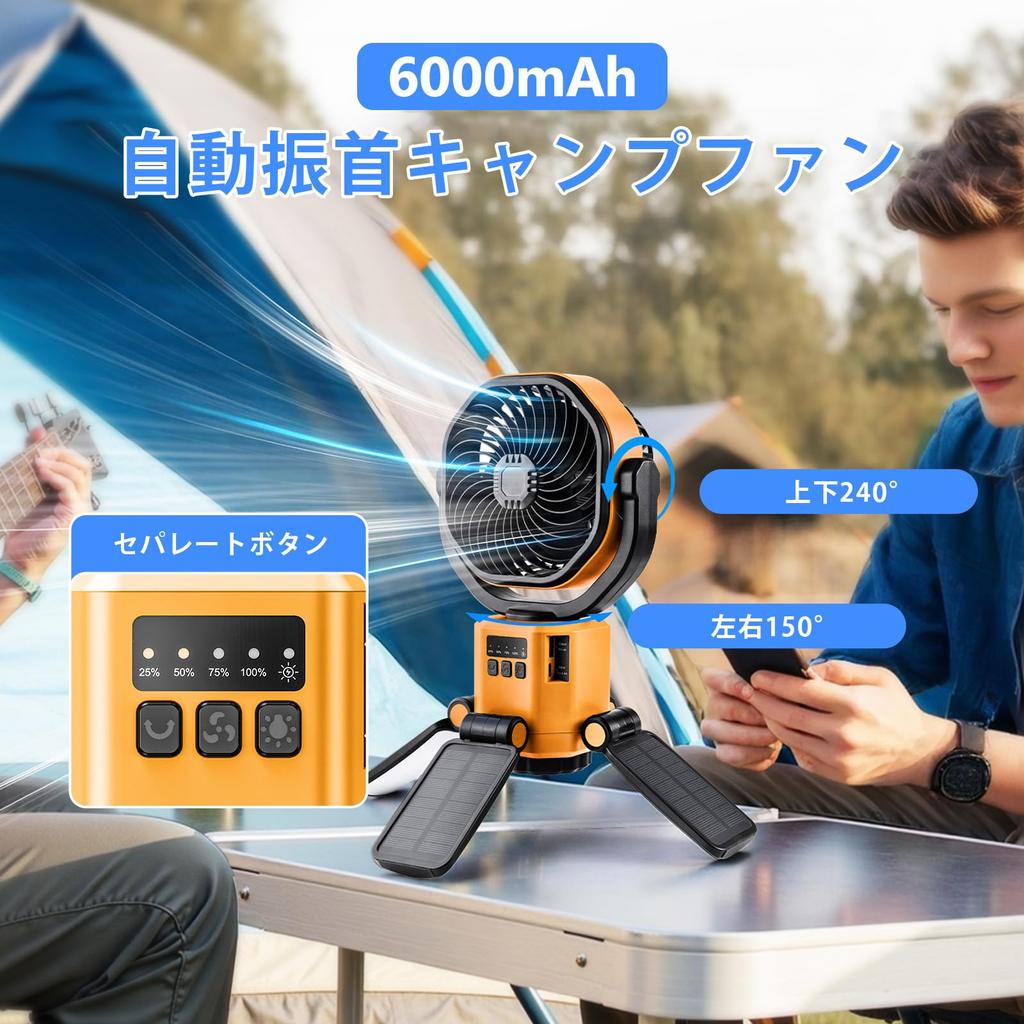 Кемпинговый вентилятор на солнечной батарее с 4 независимыми солнечными панелями и вращением на 240°, автоматическим колебанием, 4 настройками воздушного потока, 3 режимами затемнения, высокой емкостью 6000 мАч, зарядкой Type-C, функцией USB-зарядки, регулируемым углом, низким уровнем шума, энергосбережением, портативный, водонепроницаемый IPX4, идеально подходит для палаток и автомобилей